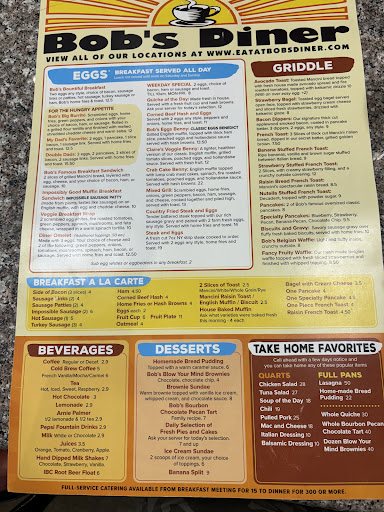 Read moreBob's diner in this location used to be such an amazing place to eat! It's sad that since Bob passed away and the staff has turned over multiple times, that it has gone severely downhill. We typically pick up from here, and almost every single time we have picked up food over the last 3 years, something has been wrong with the order... either they forget something or make something incorrectly, etc. Not only that, but every time I call to order takeout, they give me a time to pick it up and, inevitably, I end up waiting at least an additional 25 to 40 minutes for the food to come out. So, there I am, standing inside the restaurant waiting for it to be done... then they finally bring it out, I check it, and there's something wrong. Then I have to wait even longer for them to fix it! It's frustrating and mind-boggling how poor the service has gotten there. Lots of girls standing around, chatting, looking at their phones, and even eating while working, but no one seems to be accountable for what's actually being done, whether food is correct or not, whether guests are being greeted at the door in a timely manner, or checking to see whether to-go food is up yet knowing that a guest has been standing there for 20 minutes already waiting for it. We ate in a few months ago and the service was so bad that we agreed to never do that again and instead just continue to pick up. I love Bob's, I love their food, portions, prices, and menu selection, but this particular location is just awful anymore. It makes me very sad because Bob was a dear man and family friend and he had so much pride in his restaurants and his staff... :-( Maybe they bit off more than they can chew when they expanded the restaurant and made it larger. It seems like they simply cannot keep up with...