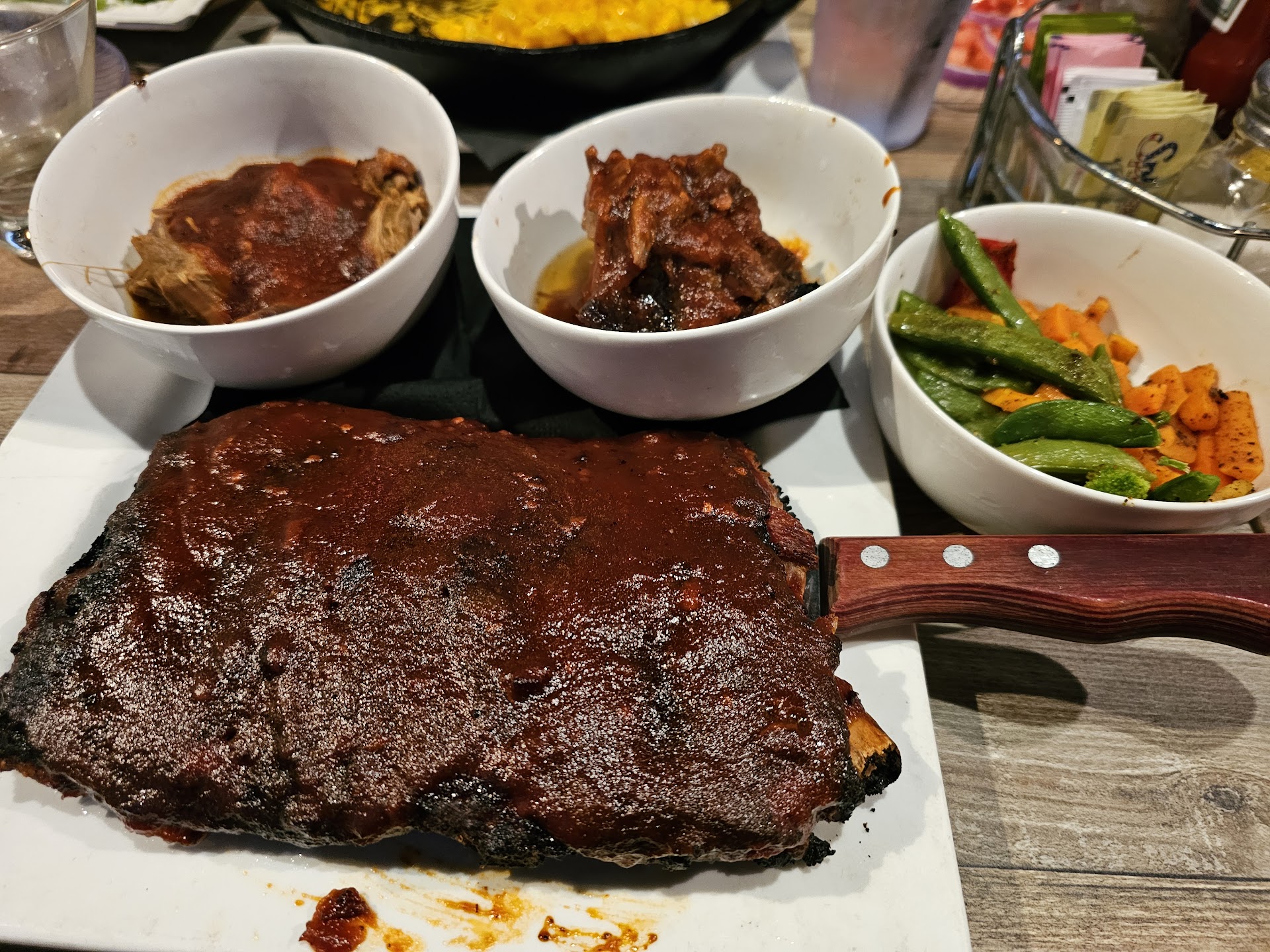 Outstanding service. We came here with a group of 30, with reservations ahead of time, and I'm super impressed with how quickly we got our food. The staff was lovely. The Ribs were super yummy and tender, the brisket was so tender it fell apart, and the pulled pork was good. The mac n cheese skillet is huge, so expect leftovers. The brussel Sprouts appetizer is shaved brussel Sprouts, which i wasn't expecting, but they were still pretty good.