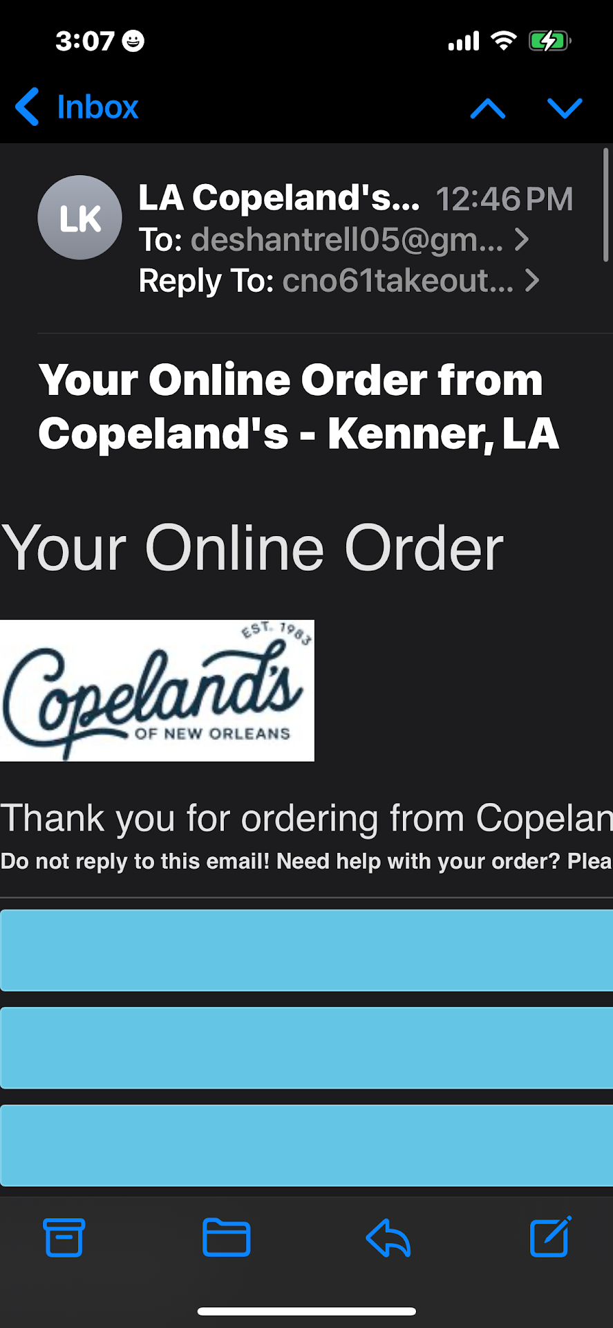 Read moreI had a disappointing experience at Copland’s in Kenner tonight. The food was fantastic; however, the waitress was not. My friend and I wanted to order dessert and where told since it was now after 9pm that no more could be added to our order. When we ask if we could take the dessert to go the waitress said no. There was a couple at the bar that had just ordered a dessert and had just started eating it. Therefore, my friend and I inquired as to why they where able to order dessert and not us. We where told by our server that they had ordered it before 9pm. The patrons sitting in the table in front of us where complaining about their steak. There server offered to take the steak back and brought them out a bowl of free biscuits to go. Additionally, we where only given a to go box for one of our items that we wanted to take home. Even though we had requested two. So, I had to put a spinach appetizer in the same box as a salad with no cup for the salad dressing. It ended up making a total mess and I was forced to throw everything in the trash. Money wasted. There where other little things as well that made this dining experience unpleasant, but the things mentioned above stood out the most. Lastly, my friend and I have made the decision not to go back to Copeland’s. Overall, we feel that we where lied to about not being able to order dessert since we where already sitting at a table eating. We could not even take it to go. Very disappointing experience to...