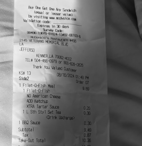 Read moreFirst off the lady in the drive thru didn’t understand nothing that was being said, I had to keep repeating myself, Here’s the real problem my daughter wanted a Filet O Fish Meal no cheese, extra tartar sauce , add ketchup. She also wanted a BBQ sauce We knew we would have to pay for the BBQ sauce, .30 cents (McDonald’s the only hard up fast food restaurant that does this) ok my baby checked the bag no sauce, even tho we were charged, glad we didn’t pull off I’m looking on the receipt to make sure he paid for one and noticed not only .30 for the bbq sauce, but also another .20 for the extra tartar sauce, no lie if I would’ve noticed that b4 I pulled off, I would’ve told them that lil .20 could’ve made up for the cheese she didn’t get. The fact that this place is nickel and diming everything makes no sense, won’t be back...