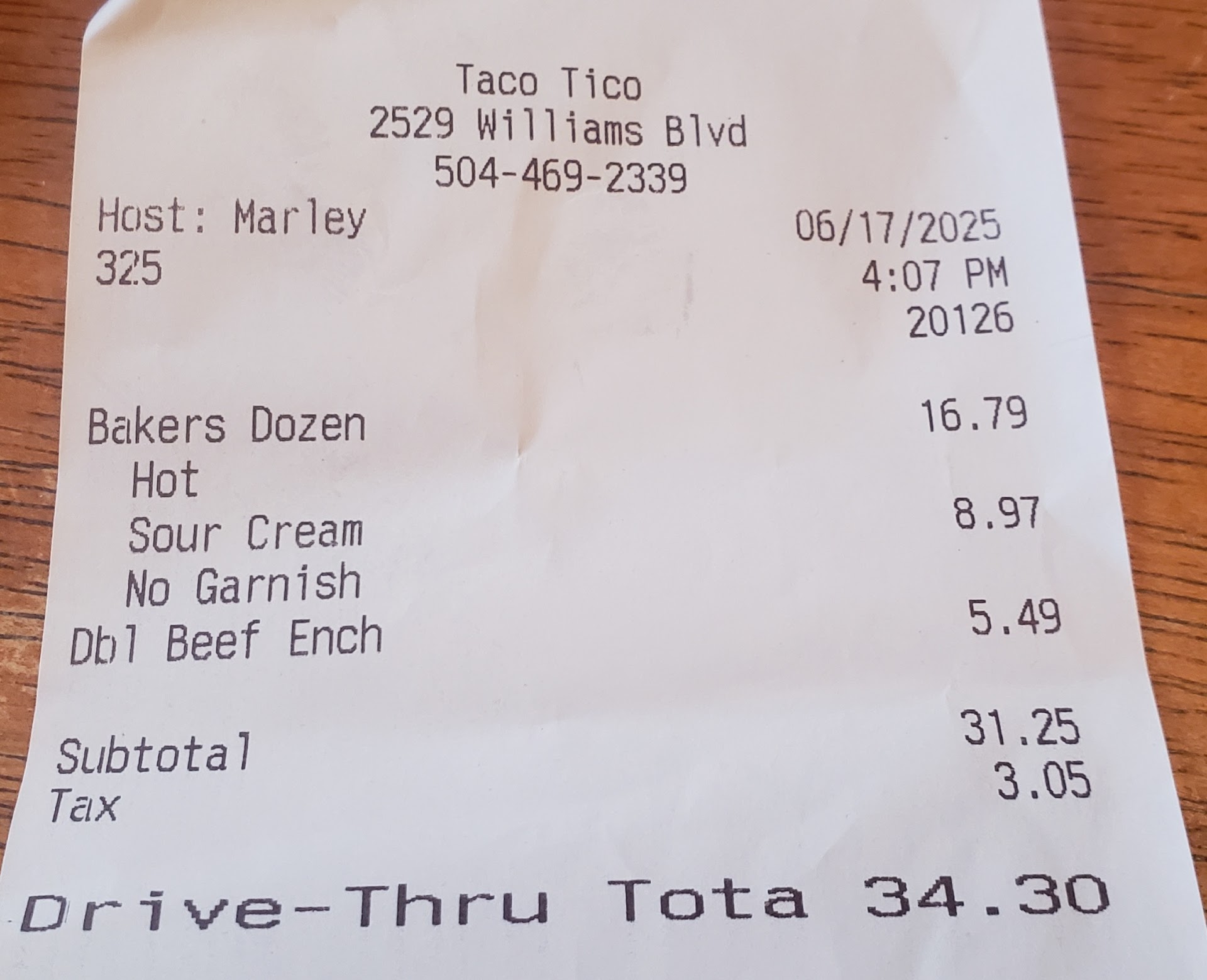 Read moreWe just left the drive thru after purchasing 2 dozen of bakers dozen of tacos from your location. One of our orders was to make those suprême.... no lettuce and tomatoes. The only thing we wanted on one dozen of those tacos was to add sour cream. Granted.... you're already saving in not having to give us lettuce and tomatoes as we ordered them without. Most places will let you know up front and tell you if there is going to be a big upcharge and offer you another way to save you money. This isn't a 5 star sit down restaurant. This is a drive thru only taco joint.