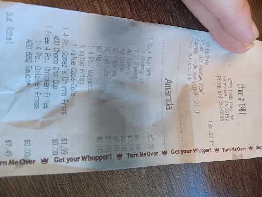 Ā Ā Ā Read moreNow this review is for whoever owns this Burger King. This was on July 3, 2022. Went to go see fireworks in Kennesaw and the little ones were hungry and as you know when you go to see fireworks it can get crazy with a lot of people and traffic. There was only 4 people working there which in my eyes is not enough for that night when you know your going to have a lot of traffic. This is my opinion based on my experience. The drive thru was taking entirely to long so we went in. Now out of the 4 one was at the drive thru and I believe she was new. One gentleman had to be the manager, one was working female was working the cash register and one was preparing the food. Now before I say all the bad I want to commend the man who was the supervisor on duty. He handled himself very good for the situation he was in with all the people that were waiting and what he was dealing with. They were all very friendly. Whoever owns this one needs to seriously re-evaluate what they are doing. First there should have been more people especially if you have new employeeās on a holiday where there will be a lot of traffic. The coke icee machine didnāt work, lids were not stocked for cups, one cheeseburger was not made correctly and it was hard as a rock from sitting, the drink machine was a mess, the line inside was very long. The food was not good and the orders were screwed up. Now with that being said, the supervisor was having to do 3 jobs at once along with customer service. My point is run your business a little better and be prepared for certain occasions where you need more staff to run your business. I know I will not be going back there and I canāt speak for any other people that were there but that was ridiculous the way it is being ran. You will be loosing customers at that rate. Food places are supposed to be clean and in order with supplies and staff to handle the demand. I didnāt want to give any stars but the way they handled the pressure of the customers was good. Other then that no it was not...