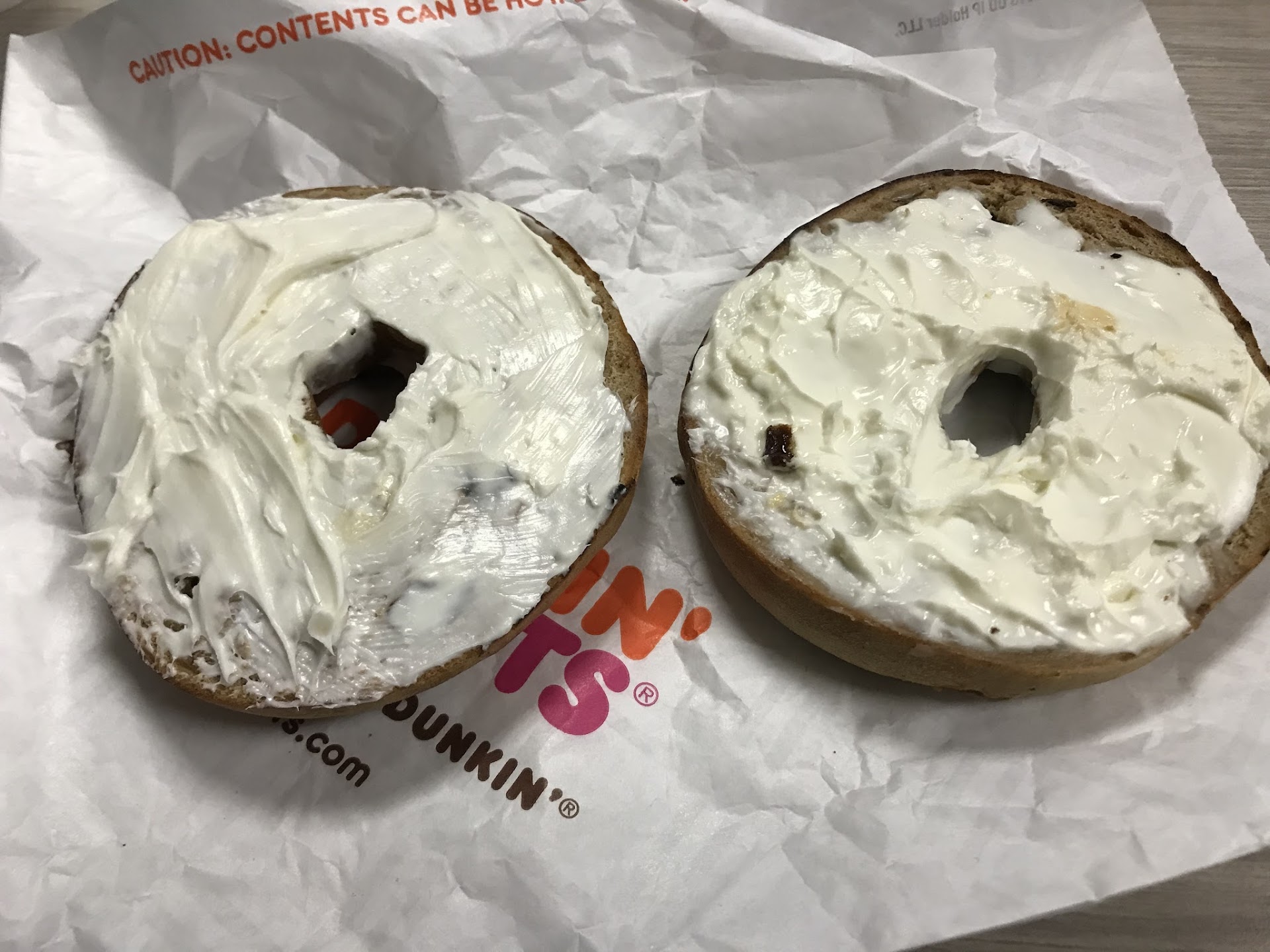 Read moreWorst Dunkin Donuts I have EVER been to! The food is not bad, on the rare occasion that they actually get your order right. I have been going to this Dunkin Donuts for over a year now (since I started my job that is conveniently located right past this location on Kennesaw 75 Pkwy at Jiles Rd.) I always get the SAME order and even though I've talked to both managers and the owner, no one can manage to figure out how to make a bagel with cream cheese. I can go to ANY other Dunkin Donuts in the area and get exactly what I ordered, but when I come here, i pay extra for the extra cream cheese I ordered and they still skimp on the amount i'm given. Below are pictures of the bagel from my most recent visit -- i ordered a toasted bagel with EXTRA cream cheese and this is what i received. This is less than a normal amount when going anywhere else. I have been repeatedly told that changes will be made and nothing ever changes as I am still receiving this. Last week when my order was wrong again (i even ordered a cup of cream cheese on the side and didn't receive that), I said i was going to corporate next because apparently no one at this location really cares about customer service. All I ask is that I get what i pay for -- i pay for extra, i should be getting extra, but this is SUB-PAR and crappy service.