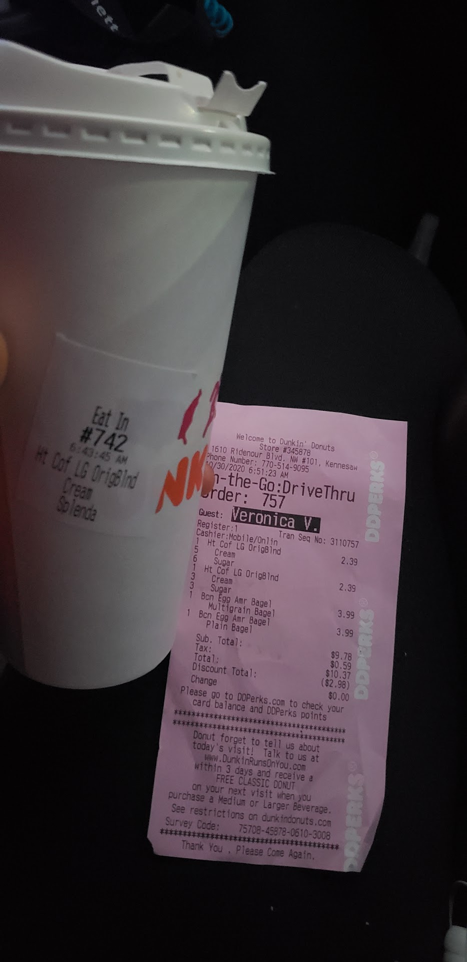 Read moreI go to Dunkin a lot! Probably too much! This location is the worst one I've visited. I've been here several times and just when I think they improve they screw up again. Drive Thru Visit #1: Oatmeal was overfilled with cold water. I suspect whoever prepared it has never had oatmeal. It's not to be served cold and not to the brim. Couldn't eat it. I did complain and this was remedied for Visit #2 but no spoon was given to eat that oatmeal. I didn't realize this until I left the Drive Thru window. Couldn't eat it. Dont ask why I went back but Visit #3 & #4 were normal, no issues. Visit number #5, again at the Drive Thru. "Can I get a medium black coffee please?" "A medium hot coffee?" "Umm...yes." "Would you like cream and sugar?" "No, just black coffee" Coffee served with cream and sugar. So much sugar I couldn't drink it.