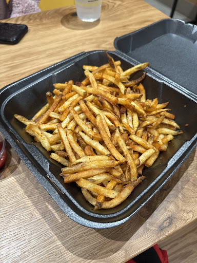 First, the sandwiches don't come with fries included like I had assumed based on the reviews here. That was my fault for assuming, though. Second, when you get fries to go, they're just loose in the bag with no container of their own. Which I guess is “okay” sanitation wise, but it makes the paper bag the food is stored in and the sandwich boxes greasy.