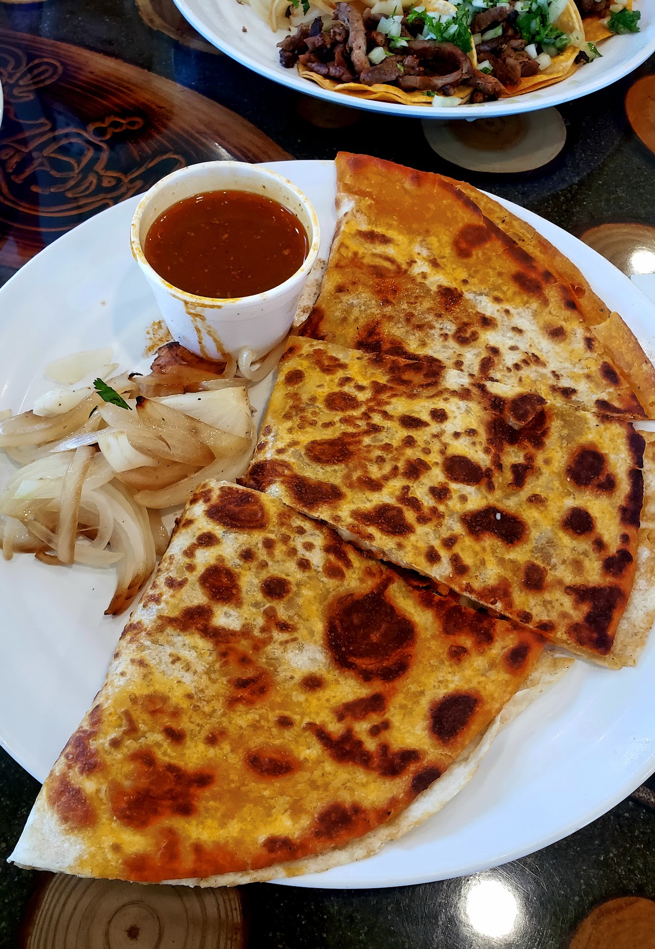 What in the seriously delicious is going on here??? I was hungry after finishing up some business nearby, it was nearly dinner time, and I smell something in the air on my way to my car, so I follow my nose across the street to this nice new restaurant with amazing pictures of the food on the menu. The pictures are not a misprepresentation btw. Oh my gurd! It was hard to decide what to order, so I ordered the quesadillas in all 3 combinations, and the gordita with carnitas...which tasted a lot like an arepa...and it was super amazing! The ajus with the quesadillas was out of this world and the sides (grilled onions, etc.) and salsa...if you have any left over use it on your breakfast...it is soooo good. Their red salsa is bomb and brings the perfect amount of heat. Their salsa verde is amazeballs too. I've not had anything this good in this area in terms of south of the border cuisine. This knocked my socks off, and I lived in San Diego for several years. This place is worth a visit, but come hungry. Their portion sizes are solid. And be patient when it is busy, the food is worth it! Despite having a drive-thru...this food is not fast food. Just the dipping ajus...somebody has taken the time to collect the drippings from taking their time cooking the different meats that are fall apart tender. Oh, and this isn't first date food. You're gonna act a fool with sauce and salsa dripping all over while you act like you've been starving for weeks before the meal...you'll totally forget your manners and talk with your mouthful to your significant others whilst exclaiming it is sooo good telling them to try this with that, etc... you only eat this with people who already love you, and will forgive your lapse in manners as they...