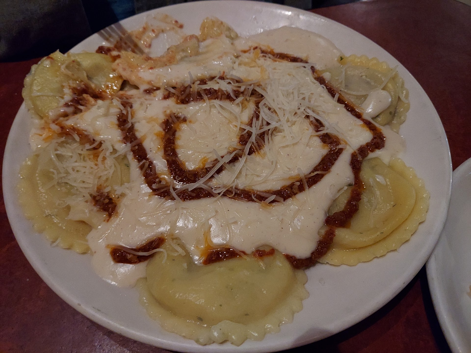 I got the Calzone, and my girlfriend got the spinach raviolis. Being a little nit picky, a little not, one thing I don't like about tomato sauces is that they're commonly watery tasting and sadly that's how it was in the calzone, but it did have the right amount. The calzone is BIG, and stuffed with mostly meats and cheese. This came with a some problems. Firstly, they bring it out with a serated steak knife that isn't really sharp enough, or suitable, to cut threw it decently especially the bottom crust. My biggest problem with the calzone was that, in the middle, the cheese and some of the meats weren't hot, the cheese wasn't melted all the way. It came out oozing and steaming, with a beautiful crust, the center was an unpleasant surprise. But I also hate half melted cheese. The spinach raviolis, we're pretty good, but the pesto on top of the creme sauce took over the other flavors giving it an almost manatone flavor of pesto. The house rolls are really good nice and fluffy with a crisp crust, with the fancy butter...