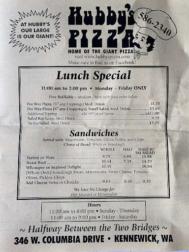 Read moreA pizza joint with an outdoor playground! Seriously, we have not seen that before. It was what caught our attention on a previous trip to Kennewick. We were determined to visit on this most recent trip. Upon walking into Hubby’s we were hit with waves of nostalgia! From the large wooden table and matching benches, prize machines, arcade games, and even a small salad bar - it gave off an 80’s feel with modern updates (games, jukebox, etc.) You can even watch as they make your pizza through the large bank of windows around the kitchen area. Though we were there at dinner, the menu states that they have lunch specials Monday to Friday. The menu includes some Favorites or Create Your Own pizzas, breads, salad bar and sandwiches. Coke products, beer and wine are also available. Pizza range in size - 8”, 10” 13”, and 16”. Toppings are pretty standard, but also includes smoked oysters and anchovies. I would like to point out that it does state on the takeout menu that the “mushrooms” are canned, but you can request fresh. The house made crust has the best of both a cracker crust and a more doughy one. My hubby called it medium thickness. It has a nice crispy exterior, while the interior was nice and soft. Good classic sauce - not too sweet. That old-school cheese blend that has some cheddar in it- makes me think of school pizza. The flavor and texture really reminded of the pizza joints of the 80’s which made us smile. We really did love the pizza. I look forward to coming back to try other items on the menu. Thank you Hubby’s Pizza for taking me back to...