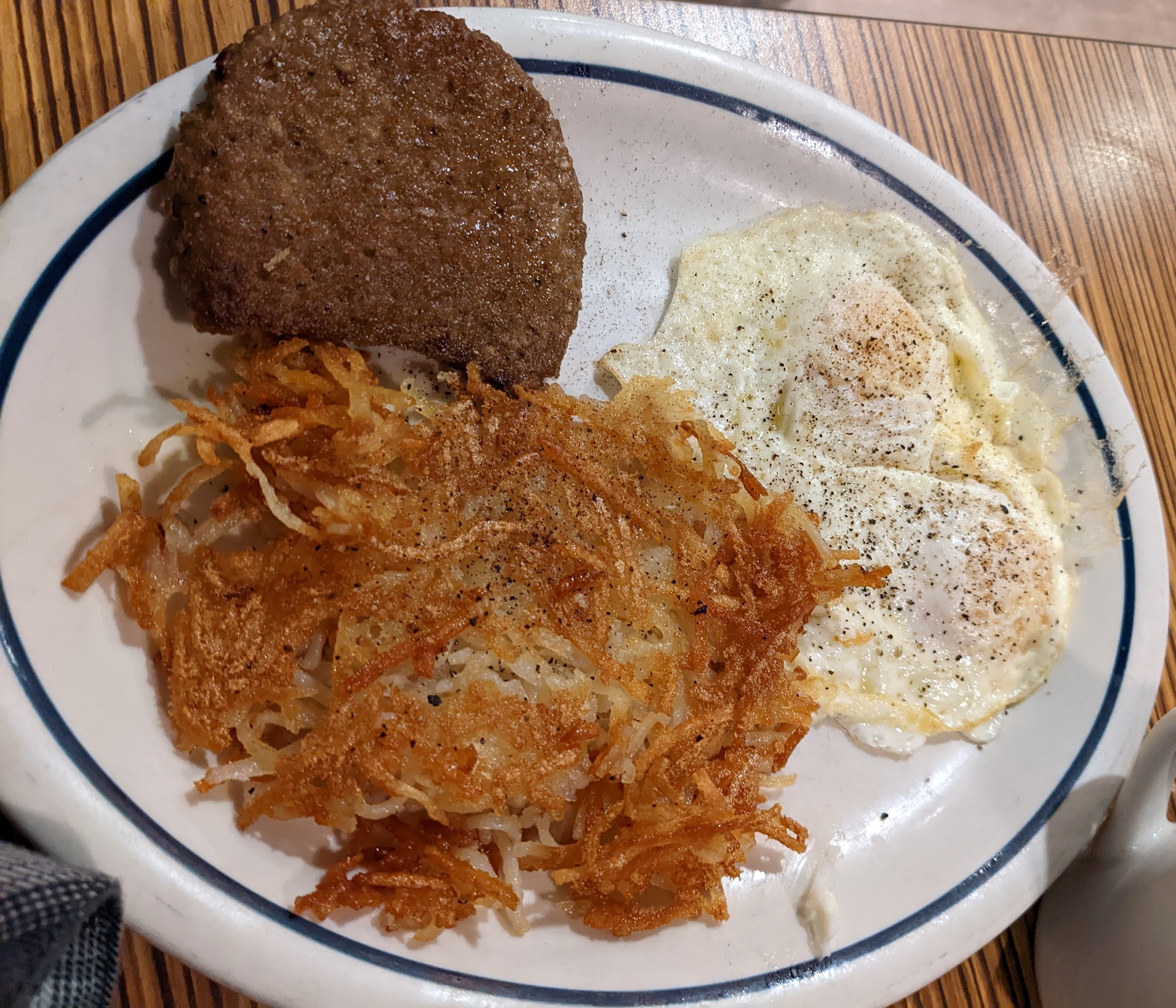 Read moreReview is like 3.5 stars, but that is not an option. So it's a chain, so it has chain style food which is fine since I know that when eating at places like this means- not an innovative meal, but usually a consistent one. The restaurant was clean with very friendly servers (the waiter was fantastic!). But they must be short staffed in the kitchen because with a nearly empty restaurant the food took over 45 minutes. I really appreciated that my food came out exactly how I asked when at many places they make mistakes with my choices. Hash browns were extra crispy (and I heard the waiter confirm before it was brought out, which is awesome), my over easy eggs were cooked correctly (no undercooked whites which is a pet peeve), toast was dry as requested (many places slather it in butter ignoring my request), the lemon ricotta berry crepe was damn delicious, bacon crispy, pancakes fluffy, ect. Also I love that they have vegetarian sausage now, and it's actually quite tasty. So why only 3.5 stars with all these positives? Well...the food was cold. Not sure how long it sat before being brought out, but nothing was warm. Also several items were forgotten, until requested. The seasonal holiday drink was missing a component and this was left unmentioned when ordering. Food also took a long time considering how few customers there were, which made it coming to the table cold more unacceptable. Also, the French toast isn't great. The bread was not soaked nearly long enough for how thick it was, so the inside was basically toast instead of the custard texture it should be. But overall, it was decent breakfast fare, and I'd be willing to...