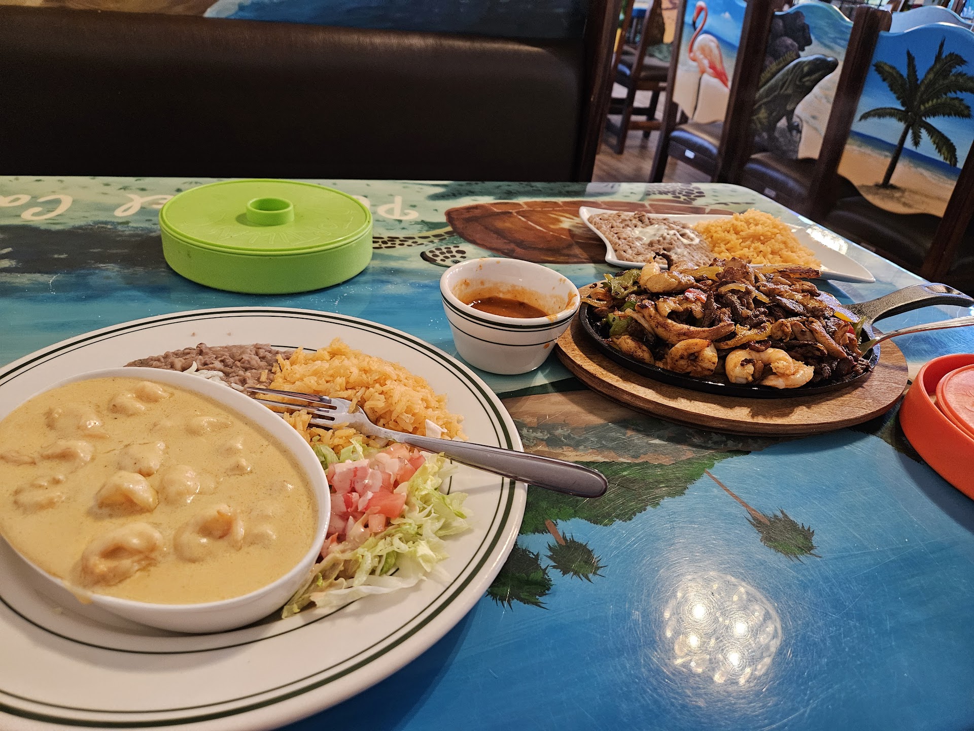 We had not heard about nor been to Los Potrillos so was not sure what to expect. The atmosphere is a whole delight of its own with individual painted scenes on every table and murals on the walls along with ornate chairs to top it off! We ordered camarones con crema & mixed fajitas with chicken, beef & shrimp. Everything was excellent! All was served with homemade corn tortillas which were delicious! Drinks were also very tasty. We...