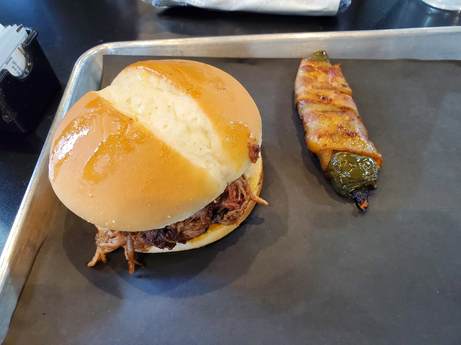 When asking me what kind of sauce I'd like, I had to ask what all they had, which is the usual of sweet and spicy varieties, and they also have mustard sauce! Not being much for mustard sauce on brisket, I let the gentleman know I would be in some other time for some pulled pork which is where I REALLY enjoy mustard sauce, and he mentioned it goes well on the bacon jalapeƱo poppers I got on the side. What a GREAT call there! The mustard sauce is a HIT on the poppers!