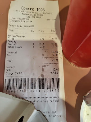 Read moreThis location had only 3 pizza types ready to eat. Of those three 2 looked old and un appealing. The third a pepperoni and sausage looked fresh thisnis what I went with. My wife got thw spaghetti and meat balls with garlic bread sticks. First the pizza overall I give it an 8 out of 10 the cheese was good the pepperoni great the sausage ok was somewhat to spicy for my taste but you like spicy umm umm good. The crust was yummy and different. Thick crispy and soft in the middle. I liked it. Now the spaghetti was 7 out of 10 the meatballs an 8. Sauce was kinda blah noodle fine meat balls tasted great but we're to soft almost paste. Total cost 3 slices pizza two plates spaghetti and meat balls $54...