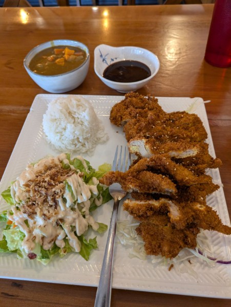 Read moreQuite an extensive menu. My hubby had the chicken yakiudon, it was flavored nicely with sesame & a warm seasoning mixture that was slightly sweet. The noodles were big & round, perfectly done. The chicken is well done. Loved this dish. My daughter ordered beef teriyaki dinner bento, with a whole california roll. Came with soup. Soup tasted very good. The salad dressing was a ginger, carrot, onion? Tempura was in a thin ,crispy batter with a salty dipping sauce. I ordered the Paradise roll, had shrimp tempura inside, avocado, cucumber, cream cheese with salmon & tuna on top. Presentation is lovely. I got a side of spicy mayo & eel/ unagi sauce.