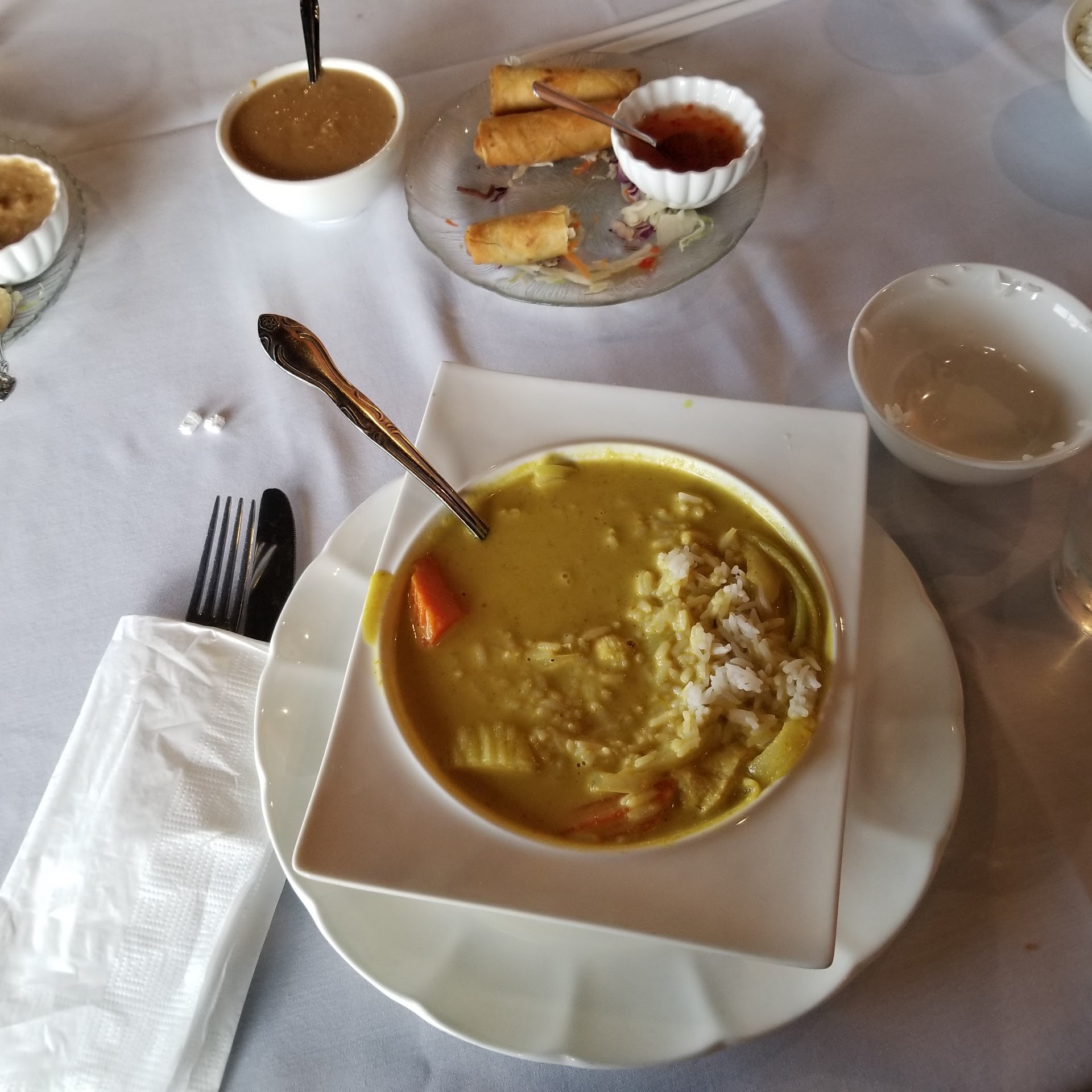 A friend invited me here for lunch. I've driven by here many, many times never even noticing it. What a shame that was because for the first time I tried Thai iced coffee. I'm in love. It is the best thing I've ever drank. I wish I could drink a few daily until I'm sick of them lol. WOW! WOW! WOW! The food we ordered doesn't even register with my taste buds after tasting the coffee. But here it goes. We ordered and shared the eggplant lovers stir fry and the pad Thai, started off with "egg rolls", which I say is wrong. They were more like spring rolls. Looked nothing like an egg roll. Even tasted more like a spring rolls. BUT. They were the second best thing with the coffee first. When I see "Lovers" at the end of a menu item, like "Meat Lovers" I assume that means there's a lot of whatever the "Lovers" is right, don't you as well? So we get the "Eggplant LOVERS" stir fry. We had to actively look to see if there was even a few slices of eggplant, far, FAR from LOVER status. Disappointing and misleading. The pad Thai was not very memorable. Bland and lacked vegetables , mostly ...hardly nothing. The taste and even the color was not traditional Pad Thai. White rice was dry with hard pieces. I let my friend take home what was left which was enough for two more meals. Once I got home I was very thirsty and drank a lot of water which tells me the food has MSG and too much salt. I eat one meal a day and am disappointed todays one meal was here. I will stop by for the Thai iced coffee tho. My friend btw enjoyed her meal and loved the black rice pudding. The servers were very courteous and efficient and the restaurant looked clean. I would recommend for those who are easy to feed. I am on the picky side. I would not turn down another invite to dine here but I'd be sure to tell them to hold the salt and msg and I'd spend more time looking at the food choices. I am willing to try again because they do have a lot of...
