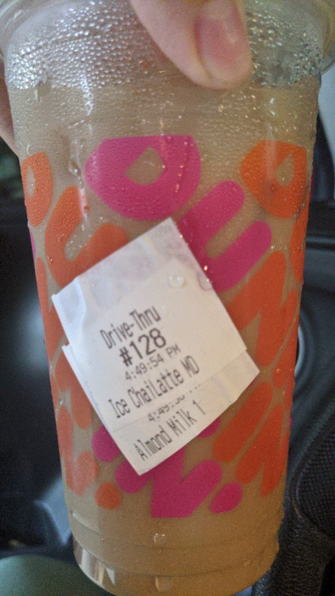 Read moreUsually this Dunkin' is the best one in the area, but today my mom and I ordered what we always order (Iced Vanilla Spice with almond milk and light ice) and got two iced Chai's instead.