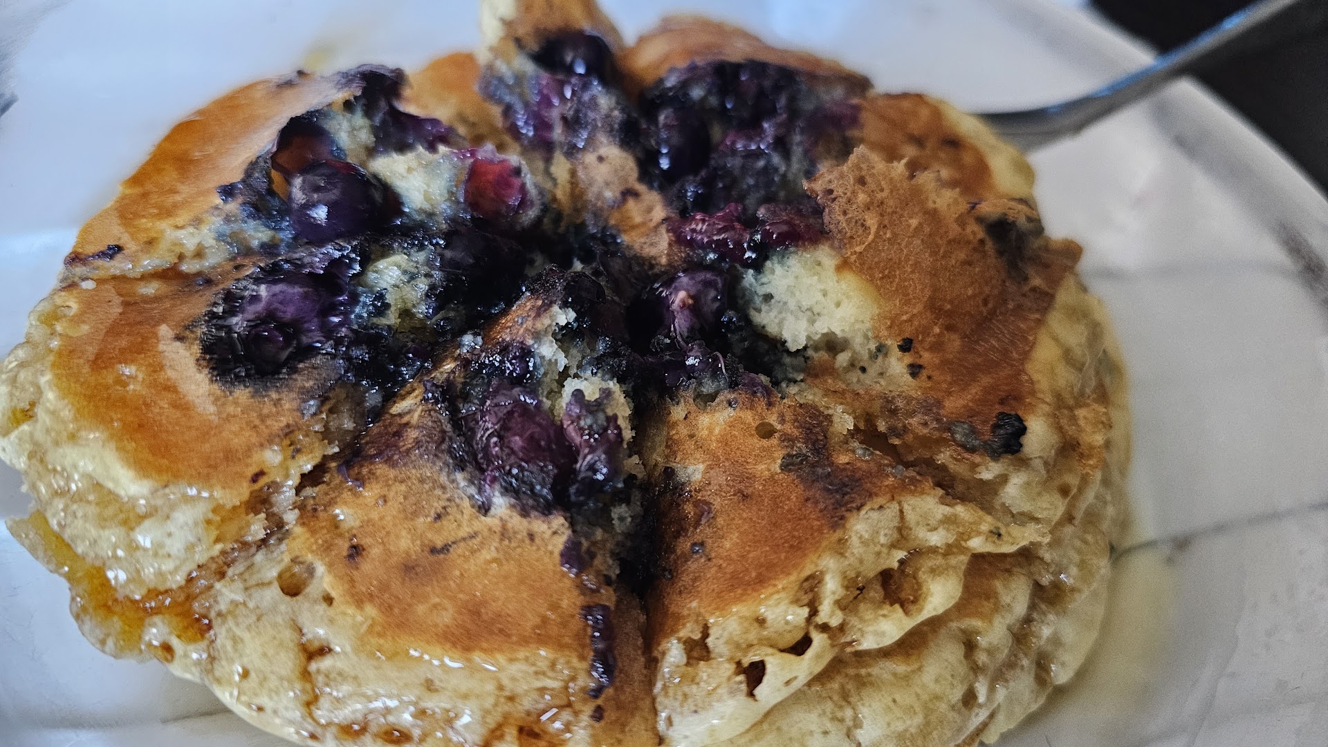 Once I got a chance to dig in, the steak breakfast bowl with eggs, potatoes, onions, & peppers was quite flavorful & delicious. The blueberry pancakes were ok.