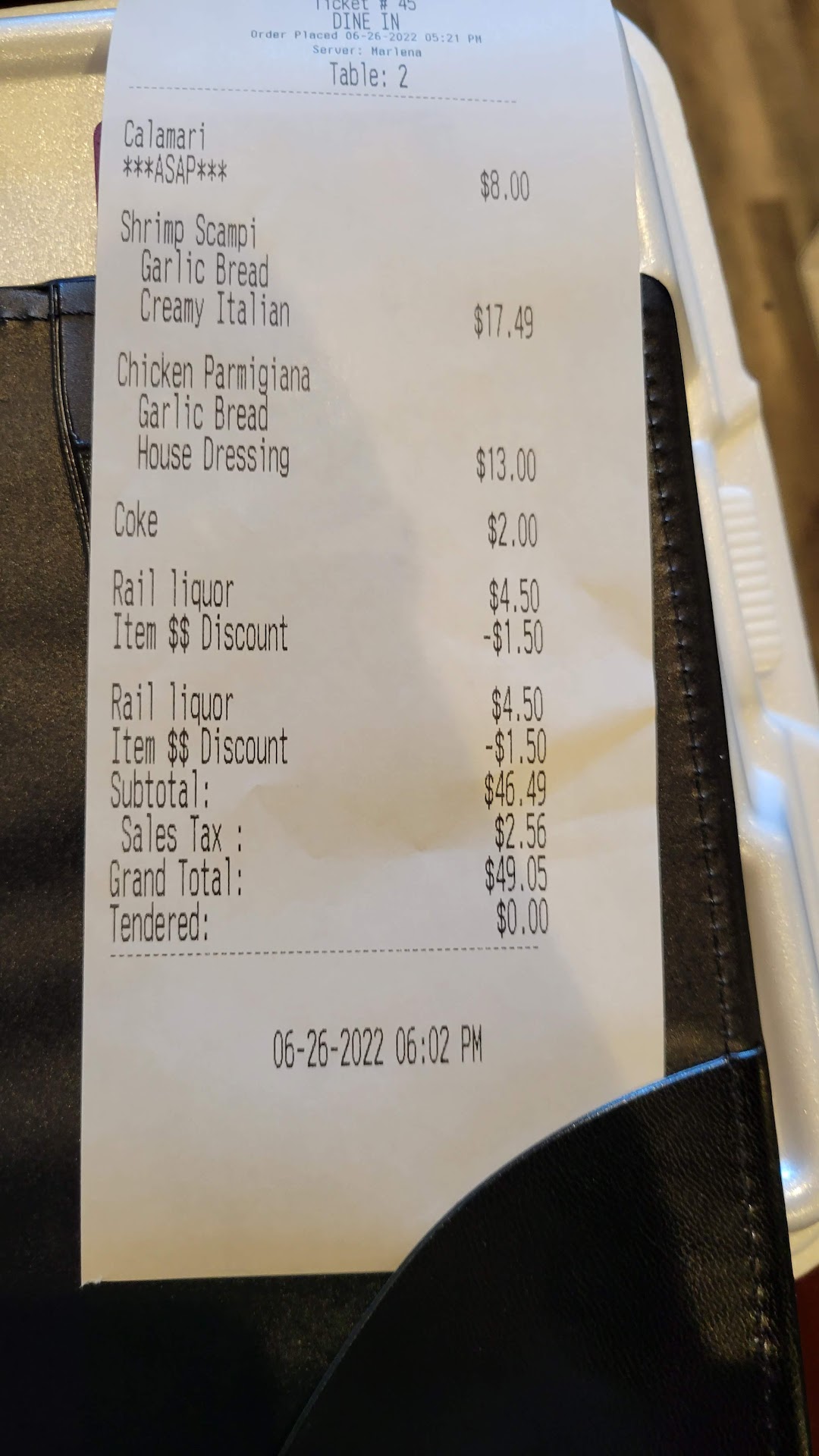 Read moreThe food was pretty decent, but everything else was terrible. Our waitress took our order and left the menus on the table. When our main course was delivered we had to ask to get the salad plates and bowls removed from the table so we had enough room to eat comfortably. That was almost the last time we saw our waitress. We were all finished eating and she hadn't been to our table once since delivering the food. I needed a drink refill, so I walked up to the front counter looking for help. There I see our waitress yacking on her cellphone, not the business phone. Instead of saying "I'll be with you in a moment", she ducked around the corner without even acknowledging my presence. A couple minutes later she comes out to our table with the bill.