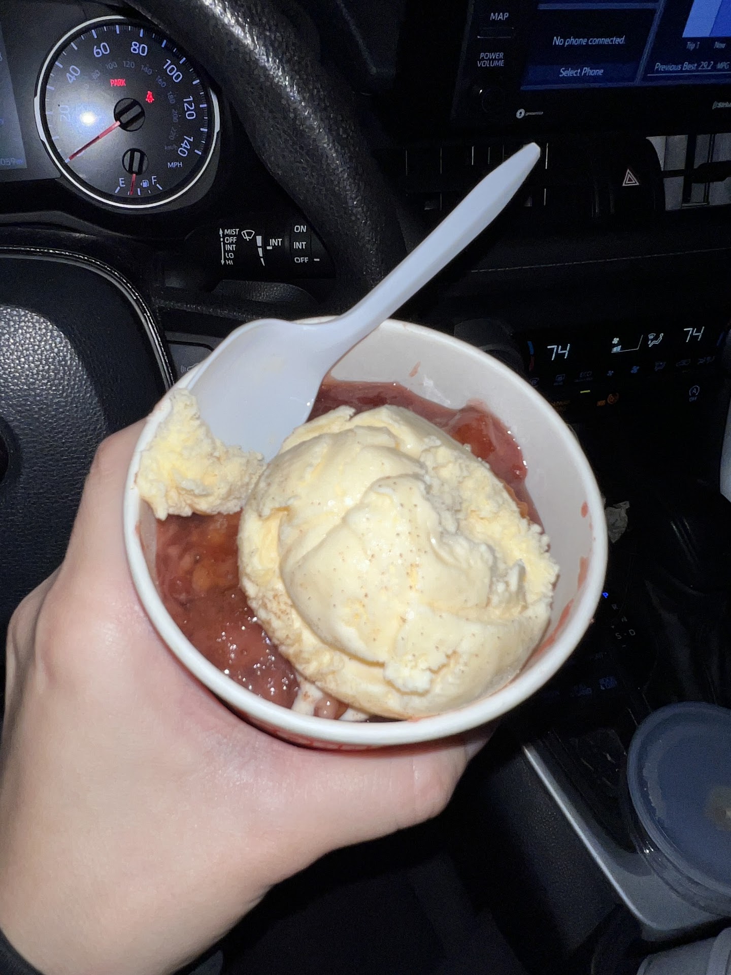 I really wanted to like this place and was so excited to try the peach cobbler. We arrived around 7pm and circled around the place. We saw that inside was pretty packed so we opted for the drive thru. I didn’t read reviews ahead of time (didn’t want to be swayed) but I ended up doing so when we were waiting in the drive thru line and many reviews talked about how slow the service is. There were only TWO cars in front of me at this point so I didn’t think it would take too long. I know this place has only been open for about a month so I was expecting to have to wait a bit, but NOT for an hour. We were in the drive thru for ONE HOUR without even having ordered either. And we had a car behind us with an elderly woman and she had no shame in constantly honking her horn as if that would get the line to move faster. It got to the point where my husband had to get out of our car and ask her why she was constantly honking to which she responded, “They going too slow!” Umm, yes ok ma’am but honking isn’t going to make it move faster. We finally order after waiting 1 hour - we should’ve just left but had already waited for so long so we were committed. It took a while to get someone over the speaker but I was finally asked what we wanted and I said a peach cobbler and honey apple cobbler. No surprise. They were out of both. Disappointing is an understatement. The establishment is called The Peach Cobbler Factory and you run out of peach….?! So we ordered the strawberry and asked for the ice cream on top. Took an additional 15 mins to get our order. Ice cream was NOT on top and on the side. I scooped the ice cream onto the cobbler (with no crumble btw) and it looked like the photo below. I would rate the taste a 2.5-3/5 stars. It was way too sweet and I didn’t even finish it. Also not worth the $8. Do not recommend unless you like mediocre cobbler and waiting for an hour. As a side note, I read on the website that there are plans to open a location in milwaukee and by the way the service is at this location, I do not think it will go well. All in all, not worth the hype,...