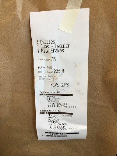 Read moreThe ladies here are bilingual, super friendly and the manager is sweet and very direct so don't think she is rude cause she isn't. She is nice and very kind and can make you laugh. The staff there is veey tight knit and very effective. They are effective when addressing uber drives and keep capacity of people to the minimum so if you need to eat, order to help them out. My most recent, I did a walkin order, they have updated everything and have signs posted to be safe for the public. The team there have a solid environment so glad to see the huge difference. It's night and day and during a pandemic. Hope management notices the hardwork and effort this team is putting in to be a great example of the franchise. If Shaq walked in, I'm sure that he would be proud of the service and quality of food. I rank this 5guys 5 out of 5. Ps. Make sure to ask for ketchup and any other condiments because due to covid they have everything set up behind the...