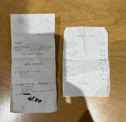 I ordered 2 dozen crabs and 1 pound of shrimp from Stevensville Crab Shack, placing my order a day in advance and paying in cash. When I picked up my order the next day, I was given one large bag and stapled to that bag was a receipt listing both items that I ordered.