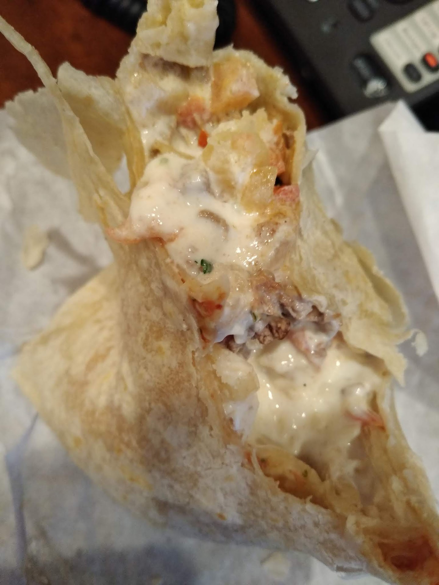 EDIT - Changing from 2 stars to 1. Went back once more and ordered the same thing, informed them of the prior missing sour cream. They didn't charge me for sour cream this time but put dang near a whole tub of sour cream in it, likely because I had a (legitimate) complaint of paying for something I wasn't getting. They clearly put waaaaay too much sour cream in it because of my complaint, making this burrito nearly inedible. I'd go here once-twice a week for lunch but never again now. Very disappointed. Worst service...
