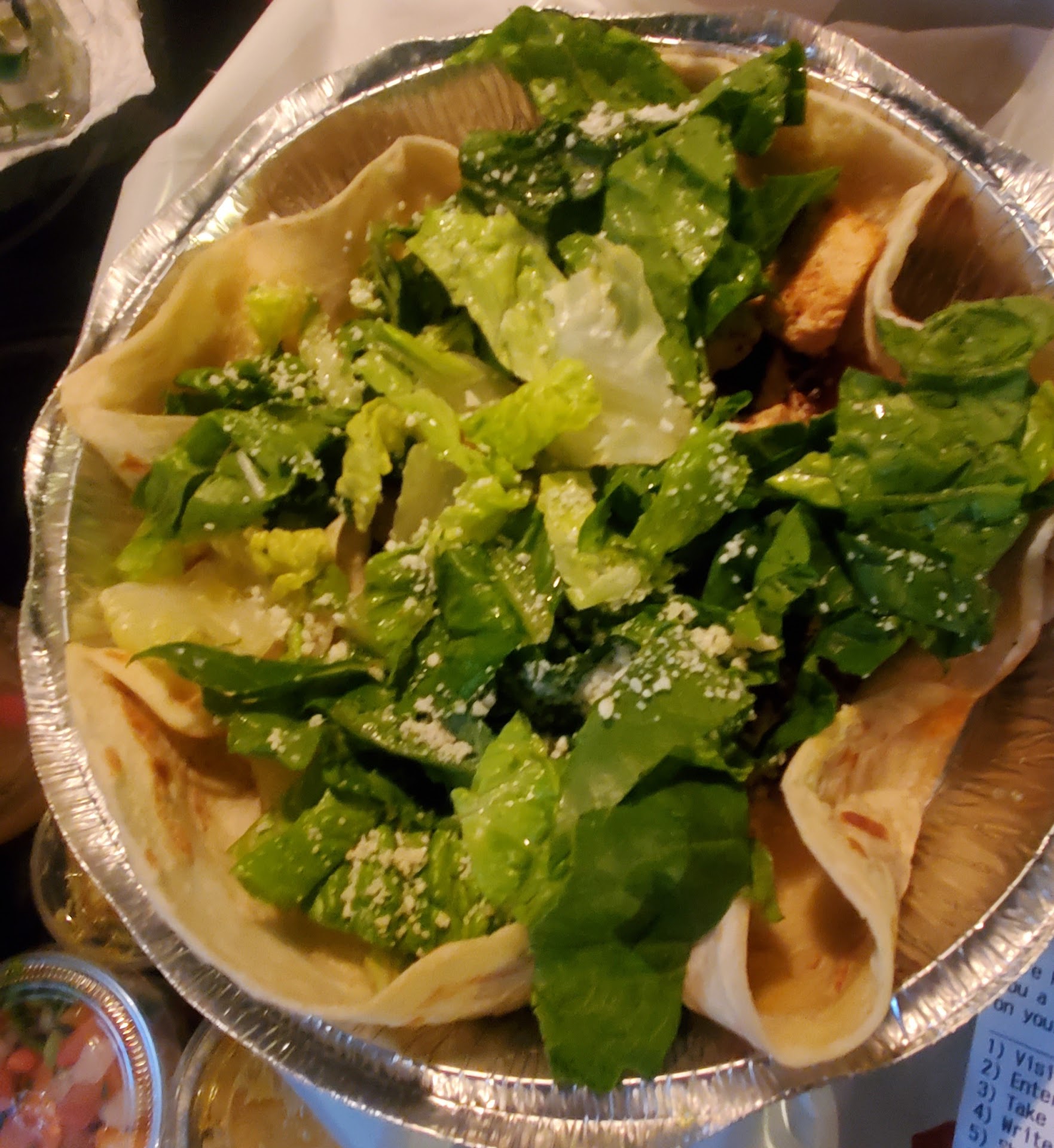 I asked them to leave off tortilla, rice, and beans since they don't go on a salad. She asked what I wanted. Again, I said that I wanted a salad and she asked what meat. There wasn't any lettuce in the bowl. Who puts meat under the salad? Anyway, I asked for the steak and pointed to the grilled veggies, guacamole, sour cream, and dressing. I asked why I only received a very small scoop of guacamole. She said that the salad only comes with one scoop but if I had called it a fajita I would have received two scoops! I would have had similar ingredients! I could have thrown away the fajita parts.