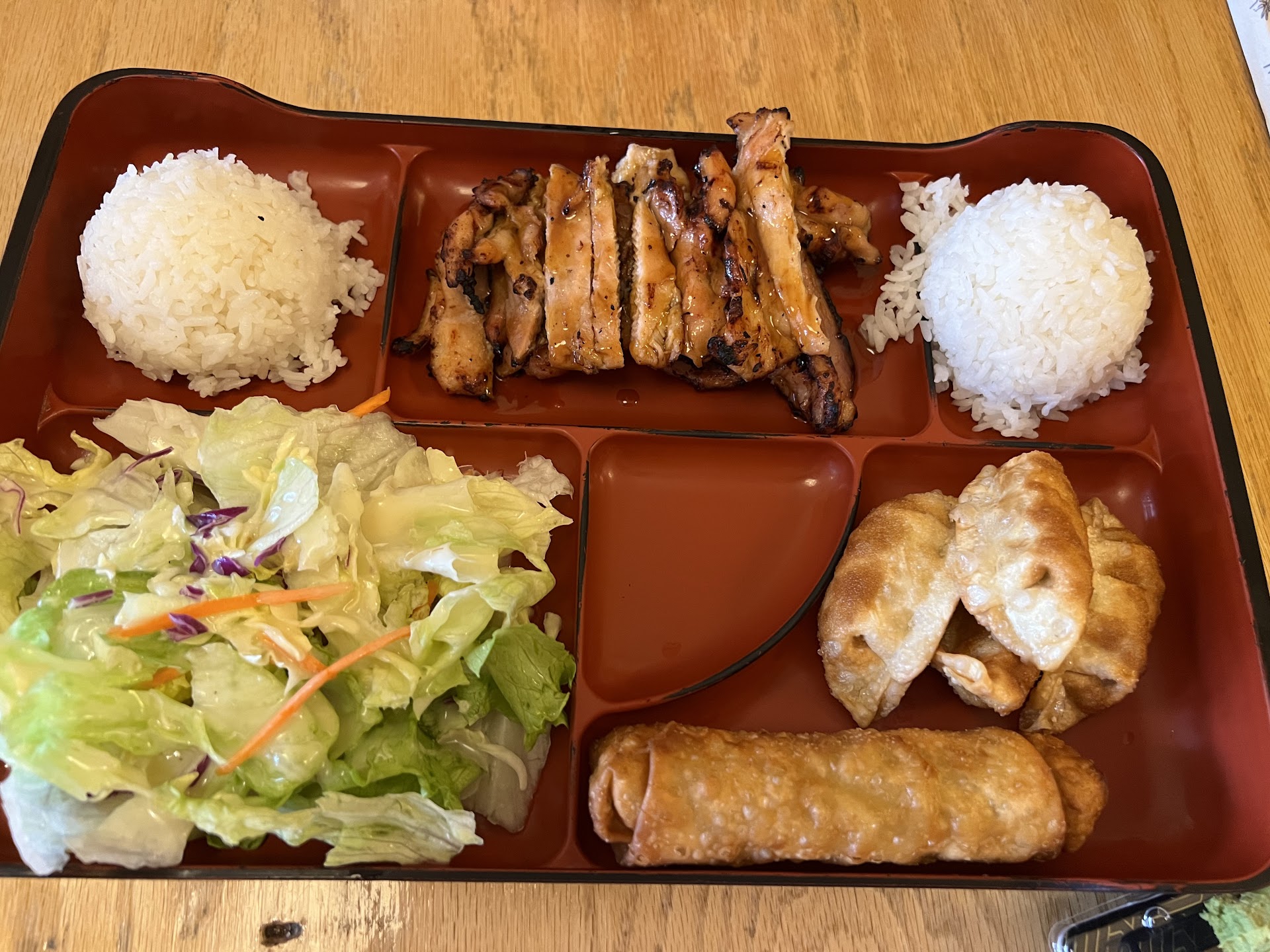 I've been living in Kent now for 3 years, and I have been searching for a good teriyaki place close to home. I FINALLY FOUND IT. My daughter and I were walking home and decided to check it out (it was also close to school). I ordered the teriyaki chicken bento box. It took about 15-20 minutes to be ready, which I do not mind at all because that tells me they are making it fresh. Admittedly, after getting our meal, we stopped at a bakery two doors down and were there for roughly 10 minutes. THEN we finally walked home (another 10 minutes). On the way home, I mentioned to my daughter "I hope the sushi doesn't get mushy and the tempura get soggy" when I opened the bag, I discovered everything was packaged separately! The sushi was so tasty and fresh. The tempura was still crunchy and had a great variety (onion ring, broccoli, mushroom, carrot, eggplant and shrimp). The chicken was cooked perfectly, still juicy. And, the tempura dipping sauce was amazing. The salad was also delicious, and the steamed rice was perfect as well. The miso soup was good, I usually hate tofu but theirs was good.