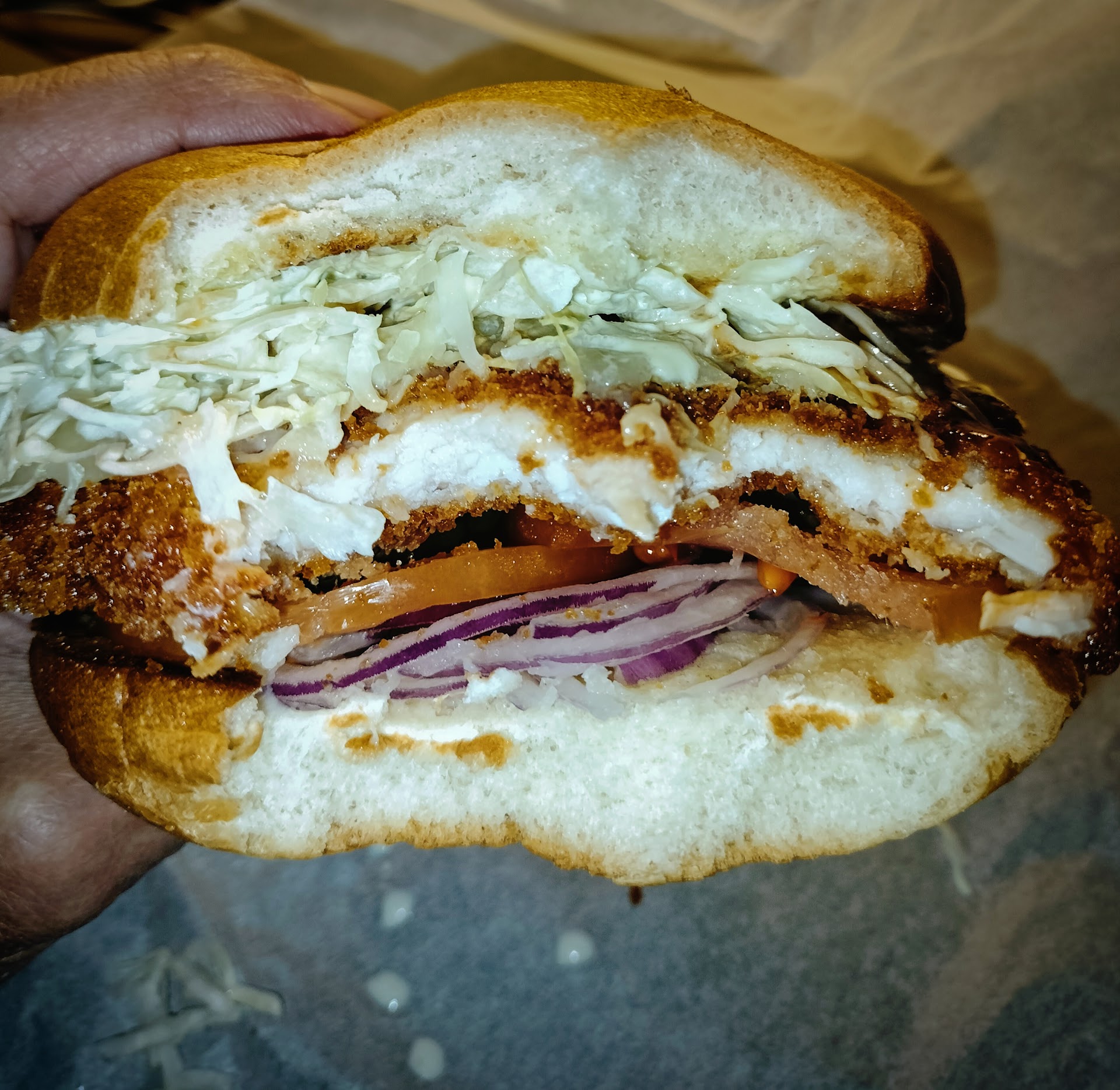 Good: Love the crunchy crust on the burger. The texture is great! The burger is piles way high. Like the coleslaw instead of lettuce.
