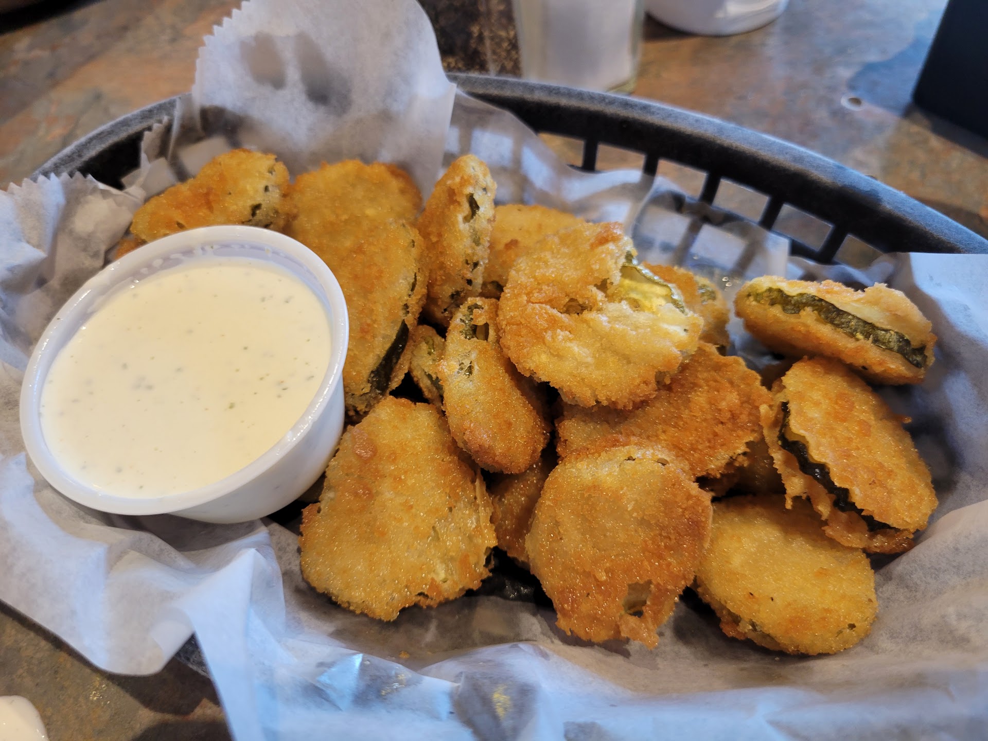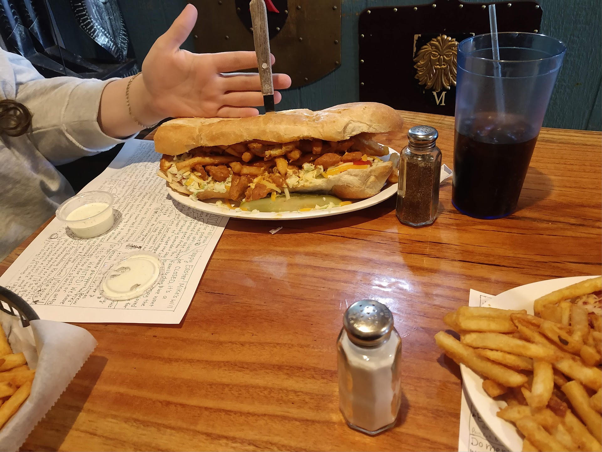 What we ordered : Fried pickles : probably the best friend pickles we've ever had, and believe me that's a lot of pickles. They were clearly battered in house, and not packaged frozen pickles. They were so crispy, perfect level of salt and didn't have an old oil taste. We ate them all without realizing the basket was empty! The Big Frikin Sandwich : they were not joking. Its huge and piled high. The BBQ pulled pork was juicy, well sauced, and tender. The Mac n cheese is actually large cellentani noodles in a thick cheese sauce. It's a lot of things with a lot of flavor and it comes together great. Queen Ann's Revenge: the crake cakes were good, very large and meaty and the outside was crispy, the shrimp was good as well. The spicy garlic parmesan sauce was wonderful. It's a very messy sandwich to eat. My only complaint with it would be that the bread absorbed a lot of the sauce, and when combined with breaded crab cakes and breaded shrimp the sandwich was a little dry. Not too dry, just needed more sauce. Side of Fries: extra crispy outside, soft and piping hot inside. We'll cooked and seasonef fries! Side Salad: Mixed greens instead of plain lettuce. And had the WHITE FRENCH dressing.. Our waitress said it's sort of tangy and sort of sweet. I can't think of a better description. When I say it was my favorite part of the meal. I mean that as a huge compliment. The food was all large sized portions and it tasted great, but my mouth is still watering thinking about the dressing. I ended up asking for an extra side of dressing to put on my sandwich!