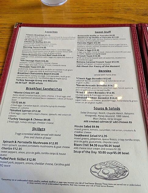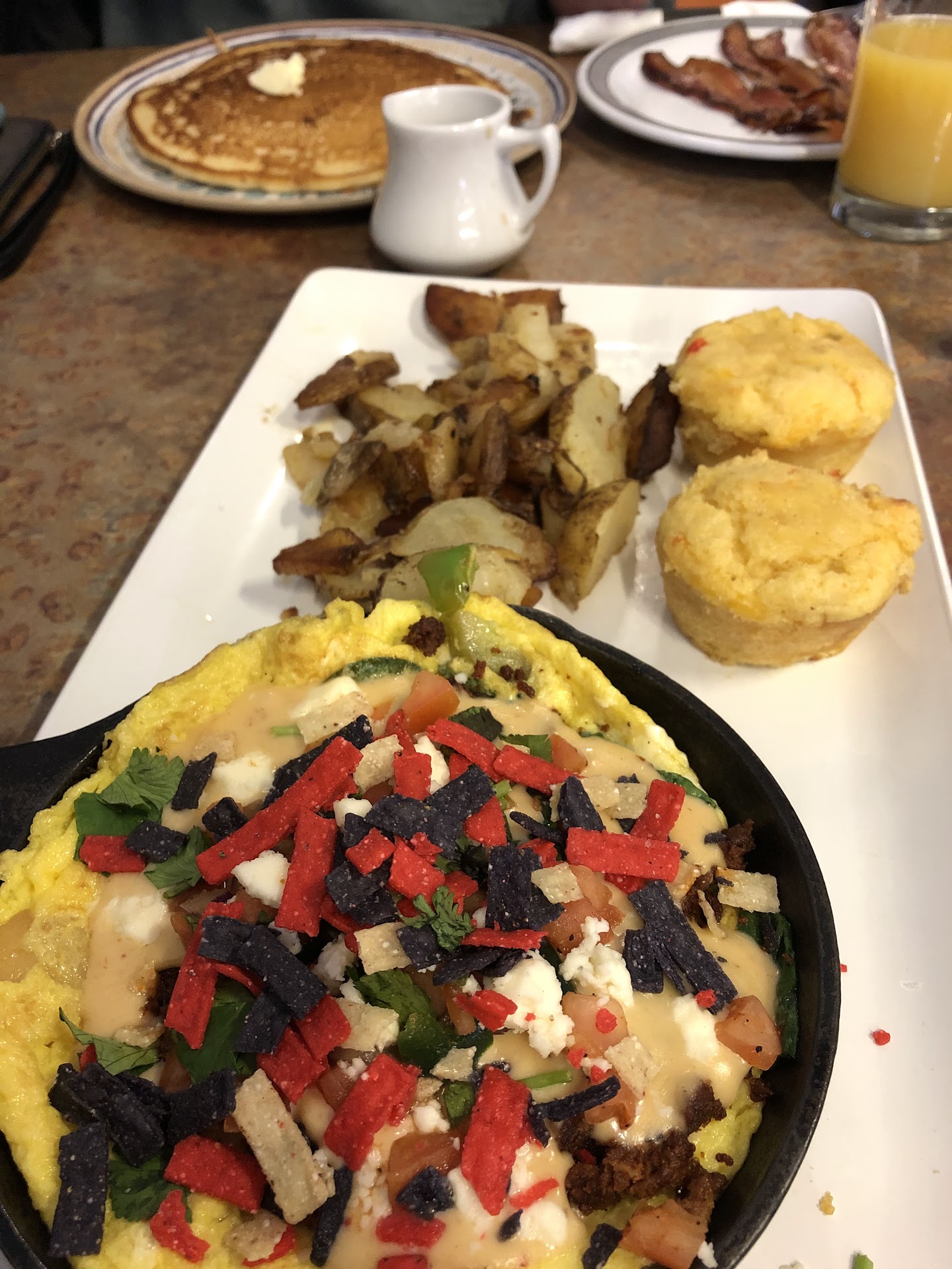 Went here for the first time with my family, we'd always heard good things about them so we figured we'd try them out. Our mistake was not making a reservation, there wasn't anything online saying we should, we figured the wait wouldn't be too bad, especially because there were only 4 of us. There were three small groups of people ahead of us, we were told it would be a 10-20 min wait. While waiting some other people had walked in and waited inside the restaurant, some had reservations and got seated quickly which I understand. The three groups in front of us were called so we moved inside thinking we would be called next. Groups of 2 or 3 people continued to come in and they didn't have reservations because they said no when they gave their names. There were two women sitting at the desk by the door, the one was only answering phone calls or taking names and the other was just sitting there when she wasn't making the silverware baskets. Another woman came up and was doing the seating, there was no organization, she didn't go down the list in order or by # of people in the group. There were multiple tables opening up that sat 4 people, I thought we would be next to be seated unless a reservation came in, which one did and was seated before us, I understand that. However, there were 2 groups of two people that were sat at four person tables that came in after us without reservations. (Others were sat at the 2 person tables or the bar.) A 4 person table opened up and a booth had been open for over 10 minutes. The woman doing the seating called our name and came over and told us she'd seat us next. 5 minutes later she called the name of another 2 person walk in and sat them at the open 4 person table. The booth was still open but she didn't seat us there, we waited another ten minutes before another table opened up and she finally put us there. They need a seating chart or something else to keep them organized. The 2 women sitting at the desk should've been keeping track of what time people came in for walk ins and went in order by who came in first and what tables were open. We waited over an hour for a table, if it was up to me I would've left. The food was okay, I tried to clean up an image of their current menu that I found. I'm going to stick with places where I can get more than just 3 pancakes for over $13. The only reason I gave 3 stars was because our waitress that took our order was so sweet, and so were the ones who helped bring...