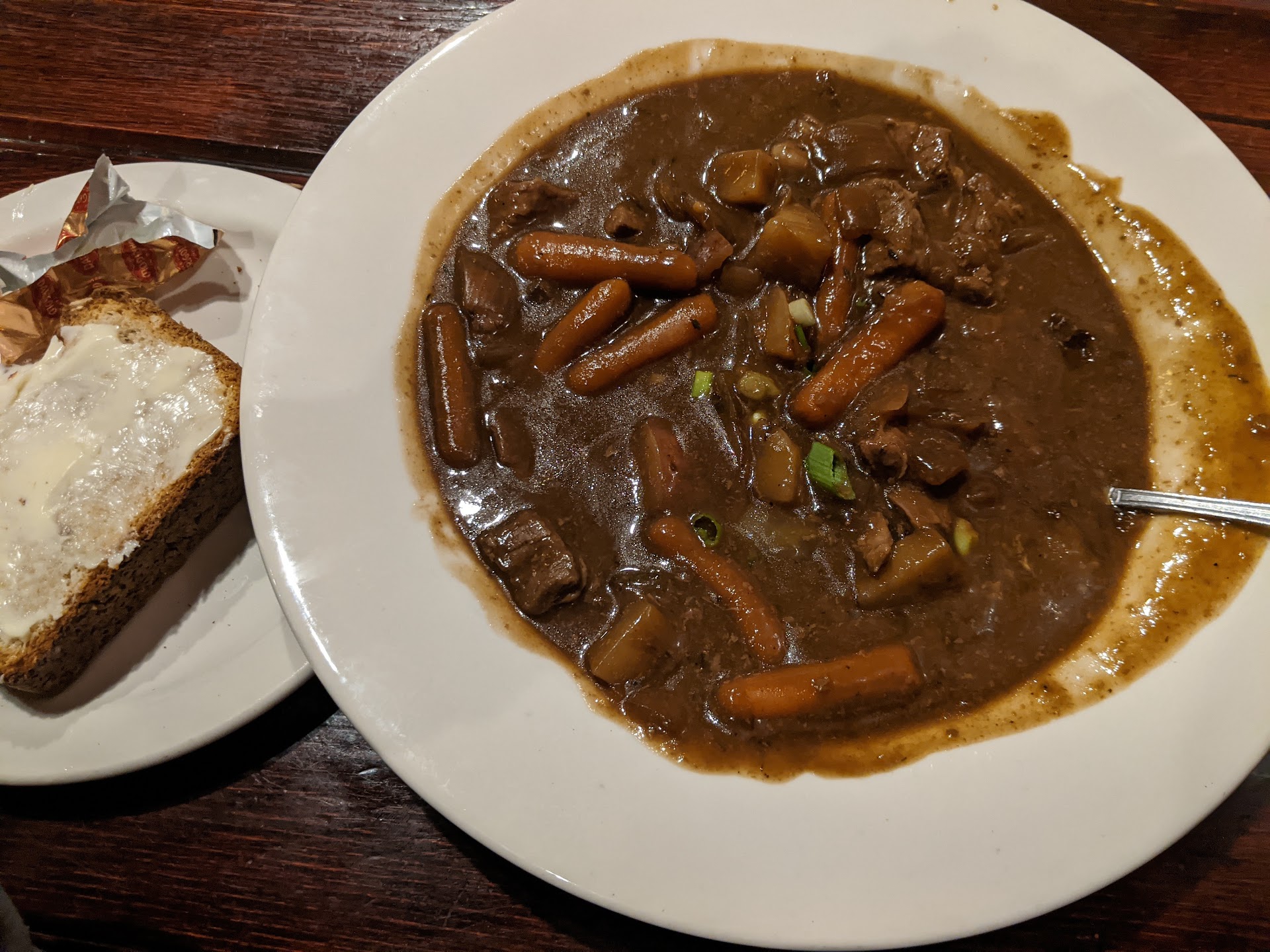I paid $15 for something the kitchen managed to make uniform-brown in every dimension of culinary experience; color, aroma, texture, and flavor; baby carrots, apparently out of a bag, with stringy cubes of beef, along with the usual onions and potatoes, all stewed down to near oblivion in a base that seemed to be primarily made of Kitchen Bouquet browning agent... with a few chopped green onions thrown on top. (Photo included)