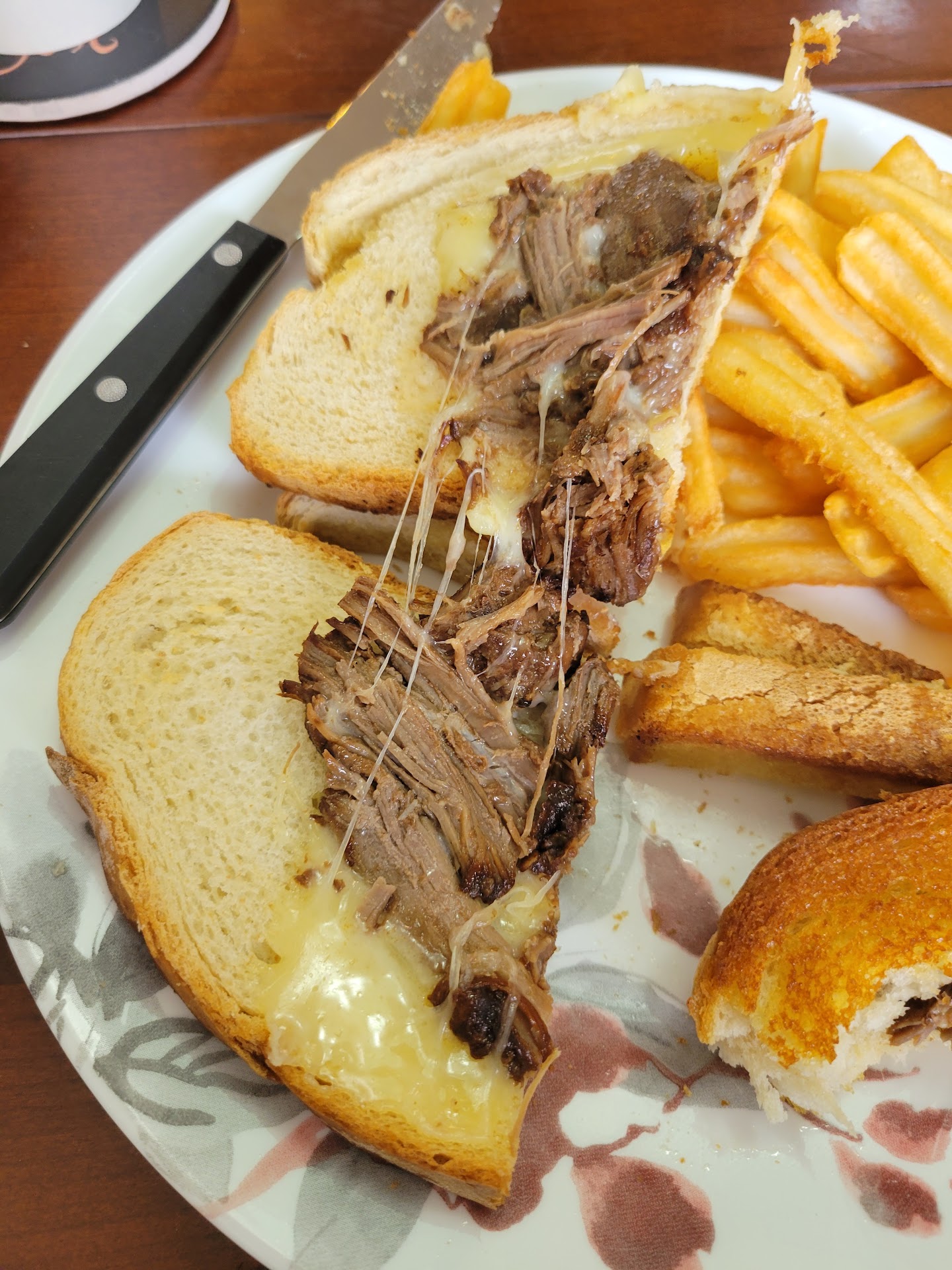 I ordered the Giddy Up Melt with fries and a drink for delivery. The melt was advertised to come with barbecue sauce and pickles, but mine arrived with neither. The actual brisket and cheese took up only the middle half of the sandwich bread, leaving a dry inch and a half on every side around it like the worst part of a classic patty melt. The fries were undersalted.