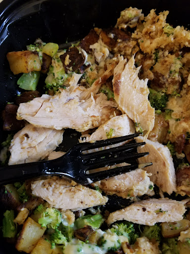 Read moreStayed at the wonderful Holiday Inn Express and needed a hearty meal. Ordered easily online for that specific location. Was called by the manager that they no longer carry a specific item. That was fine, easy fix. Order was ready in twenty minutes. Walked in the side door to pick up. Greeted curtly by frazzled cashier. Two families were waiting to be seated with a half empty dining room. Cashed me out first... wish I had waited because I tipped before I knew of the problems... lol. The cashier was in a hurry and handed the paper bag to me. I inspected and found cold open salad boxes, cold coconut cream pie and dressing, packed with hot food... buttermilk ranch packets on the bottom beside the tiny pot pie. Spilled green bean juice all over the bottom. Cashier removed everything and replaced bag. I set our cold items to the side for a separate bag. NO napkins, condiments, or silverware included... had to ask and she seemed very irritated to oblige. Upon leaving, no "sorry, thank you, come again, have a nice day"..NOTHING. Upon opening my entree, it had been handled so hurriedly, sauce had leaked out everywhere. Ugly burnt chicken and burnt potatoes... by the time I removed the burnt part, there was about seven pieces left... see pictures. Husbands entree... tiny little pitiful pot pie... included fork in picture for portion size comparison... see pictures.. Won't...