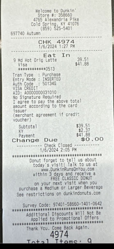My coffees were great however the employees were kind of rude. I knew I had a larger order (4 of the same large drink no modifications) so I went inside to prevent a drive thru back up. I ordered and the girl apologized to the other girl making the drinks right in front of me stating she’s got “4 more going back”. The only reason this rubbed me the wrong way is because she’s almost insinuating that my 4 drinks are the reason she’s backed up and the reason for the other girls stress. I didn’t rush them and actually encouraged them to take their time. I put $5 in their tip jar right in front of them and waited patiently and the entire time I just felt like a burden. When my drinks were done I kindly said “thank you” and the girl didn’t acknowledge me. This experience has put a sour taste in my mouth from ever really wanting to come back. I just didn’t feel like a customer, I felt like a burden even though I apologized for the big order and tipped. I’ve had orders similar to this at the cold spring Starbucks and they’re always incredibly kind and they’ve been busier than this dunkin was at the time. Short staffing could be another issue as well but I don’t appreciate it being taken out on me. My recommendation is to just be kind cause maybe you’ll have a better...