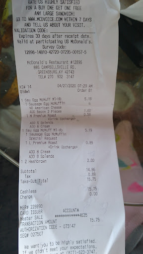 Read moreI just left Greensburg McDonald's 20 minutes ago I told him everything I wanted at the window 6 McChickens one regular hamburger no pickle no salt a large Coke a medium Coke a large sweet tea and a medium sweet tea I get to the window and paid for it and they tell him to go to the next window the guy at the window hands me all the drinks but the large sweet tea any then he sit there and argues with me I had to go ahead and pay for the large sweet tea again then I pull over and Park because my son had to walk in and get the tea I started to look at my hamburger it was made so sloppy I ended up having to throw it out the window this is not the first time they messed my hamburger up it happens all the time I think I'm done eating at McDonald's mainly the McDonald's in...