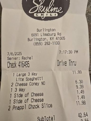 Read moreLove Skyline but this particular location leaves alot to be desired. From the server not listening to us and us correcting her 3 diff times on 3 diff issues to my money bun being so wet it was too soggy to eat. My chili cheese fries were hard and had barely any cheese. We are used the skyline on Turfway where they speak to you the moment you walk in the door no matter how busy, where all of the workers are very nice and the manager stops by your table to see how you're doing. In contrast, not one person at this skyline spoke to us or even looked our way. The table across from us sat for 10 min before anyone even acknowledged their presence. Half the tables were dirty even though they were not even busy. This was supposed to be a treat for me as it was mother's day. Definitely worth the extra 10 min drive to eat at the...