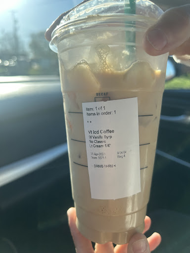 Read moreMy wife and I typically go to the Starbucks on the north end of town up by Planet Fitness and Lowe’s. Customer service is outstanding there, every time. Today it was convenient to swing by the drive thru at the location by Kroger. We’ll never do that again. We simply got one Vente iced coffee with sugar free vanilla, light cream and no classic. The young girl who spoke to us while taking our order was very annoyed. As we approached the window she never once smiled and acted extremely annoyed that we handed her our phone to scan for points then used a card to pay. Personality was horrible. I have no idea why Starbucks thought it was a good idea to put this girl in the window. She then simply handed us our drink and slammed the window shut. We had to ask for a straw and she re-opened the window again very annoyed. To top it off I’ve attached a picture of the drink we received. We always ask for “light cream” and to be fair it was printed on the side of the cub. However, as you’ll see the drink was 80% cream and 20% coffee. All around horrible customer service and quality. I’d highly recommend you avoid this location...