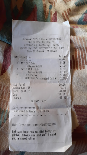 Read moreOn Friday April 5th, 2024 at 2:10 pm, my wife went to the Greensburg Ky.Subway location. The server was not friendly at all. When my wife walked up to the counter, instead smiling and asking how she could help her, she scowled and stared at her. She never asked what she wanted. My wife told her what she wanted and the server starting making the sandwiches. She picked up too many slices of cheese and instead on laying them back in the container, she threw them. She dropped the knife she was using and sighed and kicked the knife across the floor. She never said thank you or anything nice. I realize everyone has bad days, I worked customer service for 20 years and always treated customers well, even when I had a bad day. The food was very good, but the worker's...