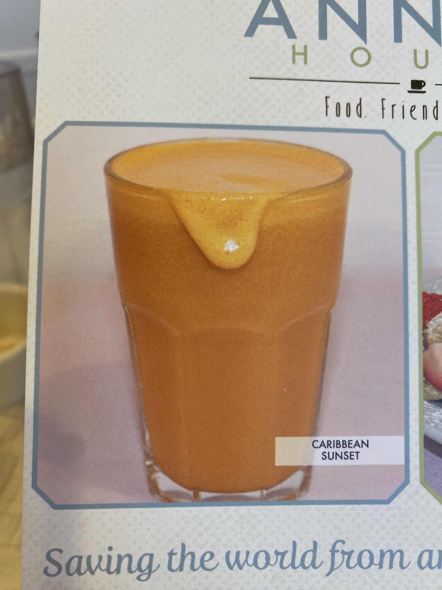 The atmosphere is retro classy with beach like blues and the staff is friendly and attentive. All seem to know the menu well and made good recommendations. One item I tried and loved was the Caribbean Sunset fresh juice. A little pricier than your typical OJ but what you’d expect and pay at a Juice or Smoothie place (not naming names here). I ordered this again when I visited another Anna’s House later in the week.