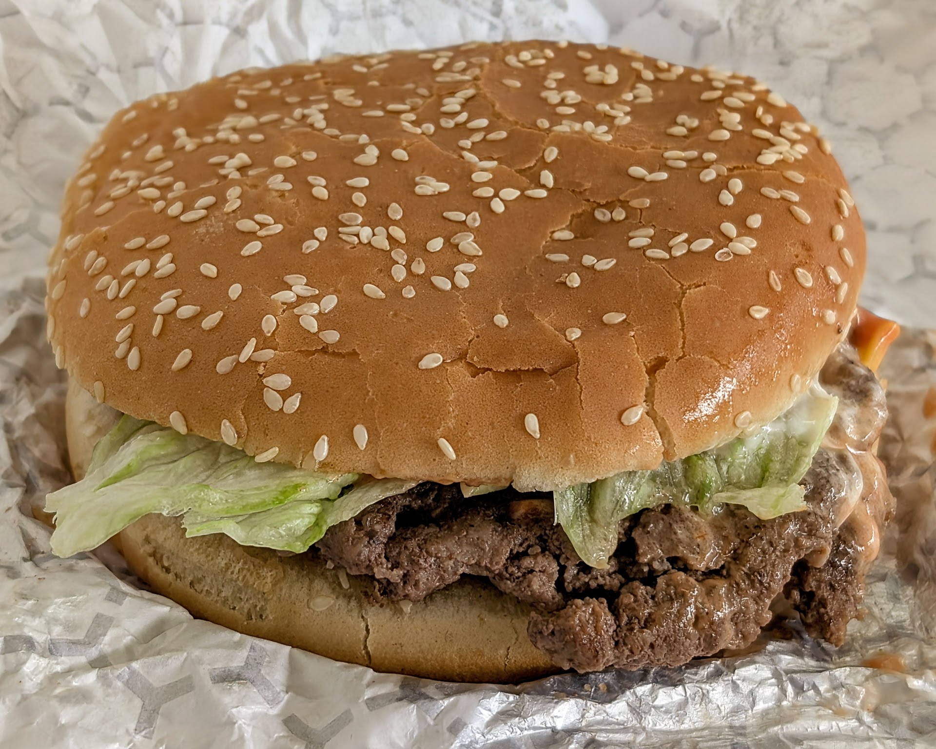 The toppings are good, but the lettuce was just a tad wilted. The sauces were in just the right proportions, too. The only two things I’d change are more preferences and very minor. I’m not a big fan of sesame seed buns. Also, the lettuce would be better shredded.