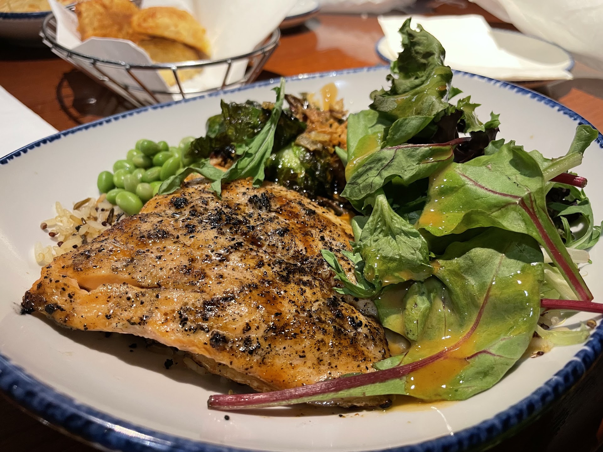 The food left something to be desired. The lobster artichoke dip was alright, nothing to write home about. The tilapia with the crab topping or whatever was totally inedible. I know tilapia isn't a super fancy fish but I've never had it be so soggy and bland. My husband's steak was gritty and tough, like the pan wasn't hot enough when they put it on so they just left it there way too long. He said his shrimp was dry and tough as well. Thank God for cheddar biscuits, which I'd wager are shipped to the frozen and ready to pop in the oven when they receive them. We put our food in boxes out of habit but left them behind at the hotel we were staying at because we knew we couldn't force ourselves to eat the basically entire entrees we ordered. The fish sandwich I had at Culver's earlier was literally better and that meal didn't cost $60.