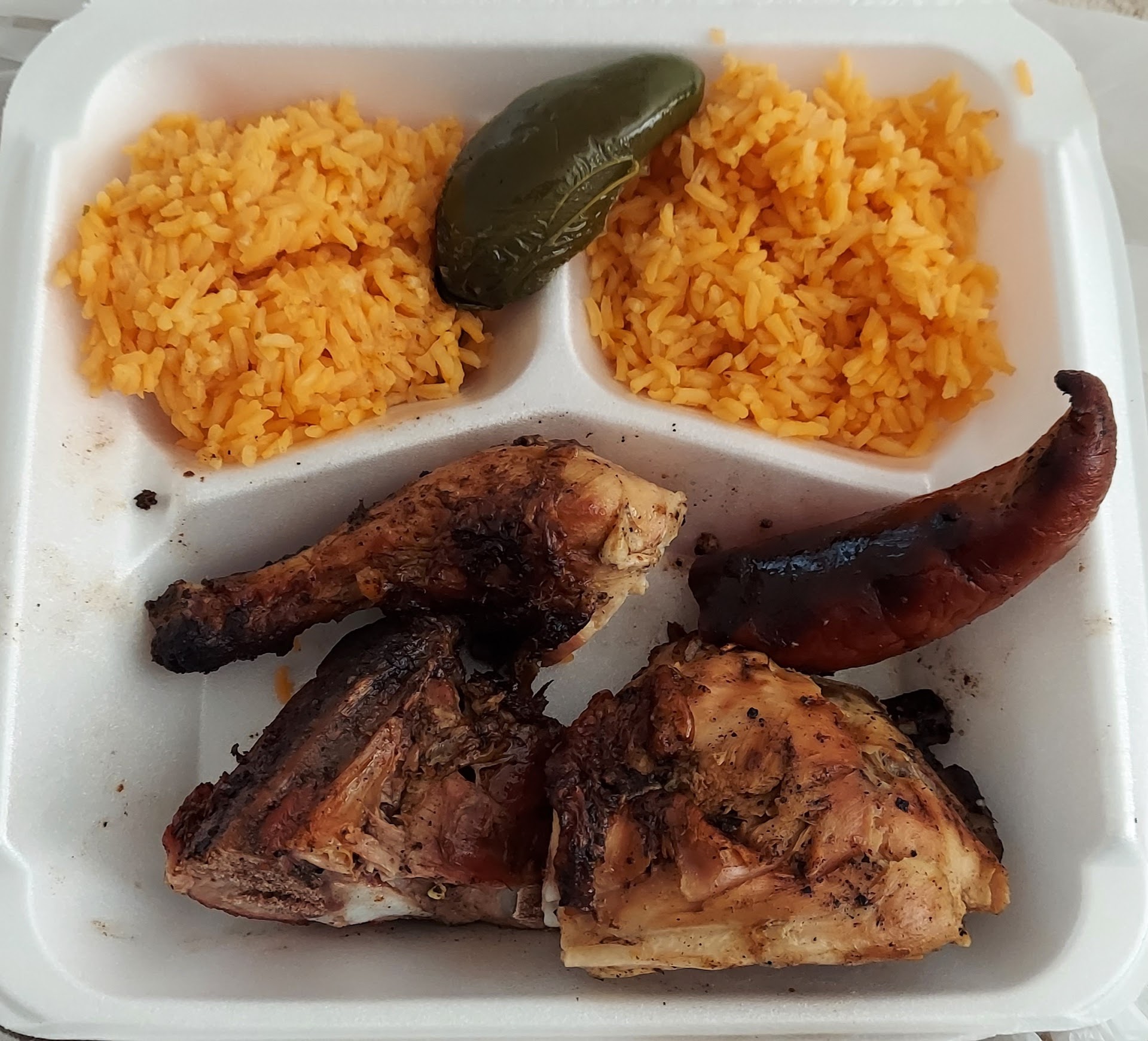 This chicken is really amazing! You might think you'll be getting fried chicken, but it's grilled, barbecued chicken. It has a really unique and delicious taste. And it kind of reminded me of being a kid eating this kind of chicken at family barbecues. I don't know what spices they put in it, but it is so delicious! Prove me wrong. Give this place a try once. The only downside is you have to order out a taco truck, and it's behind a building so you have to go through an alley way to get there. I passed it, and didn't even know...