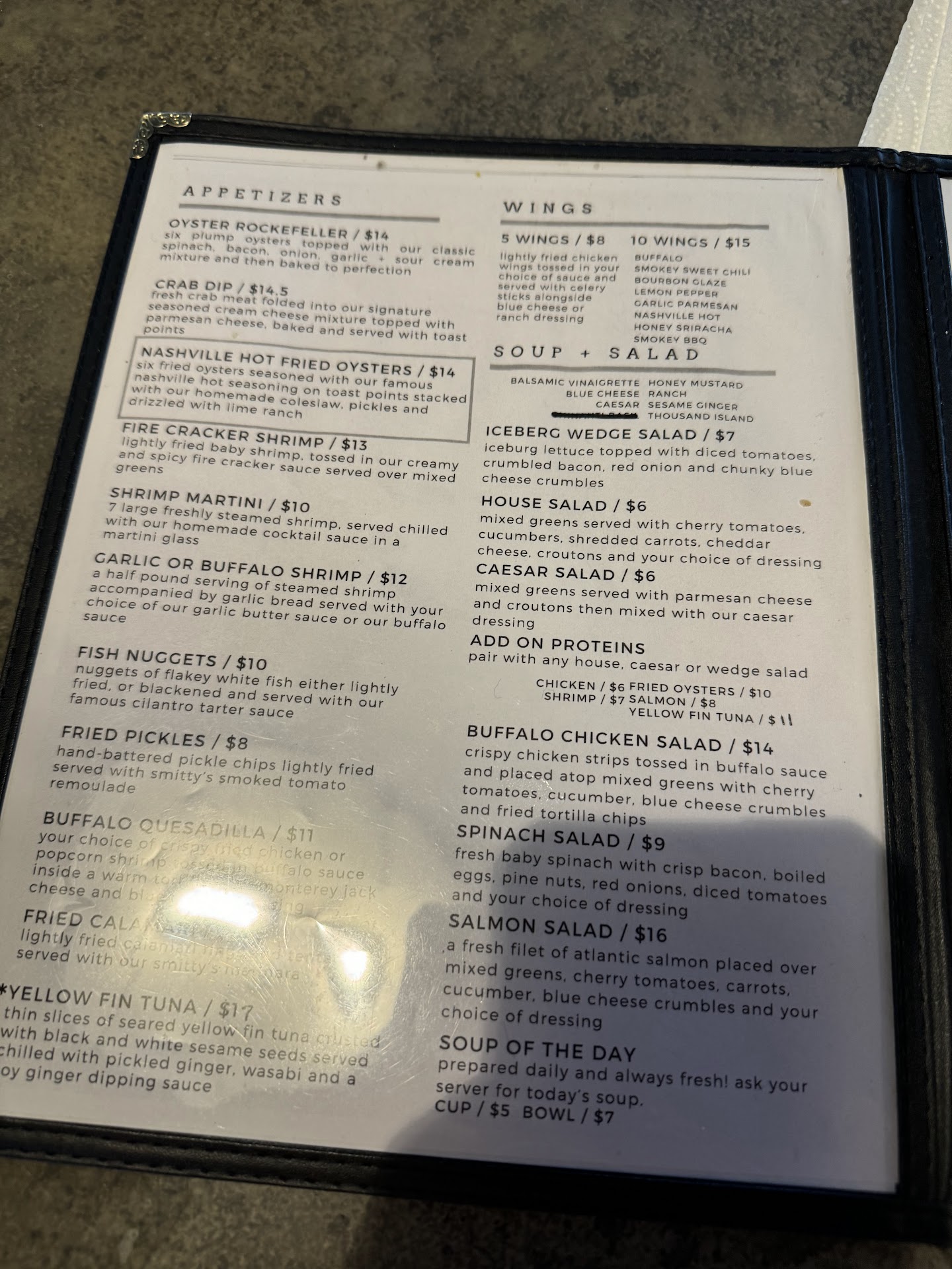 At $9 for the app and $26 for the pick three fried platter (including a $4 upcharge for oysters), Smittyâs pricing is higher than youâd expect for its atmosphere. Servers seemed friendly enough.