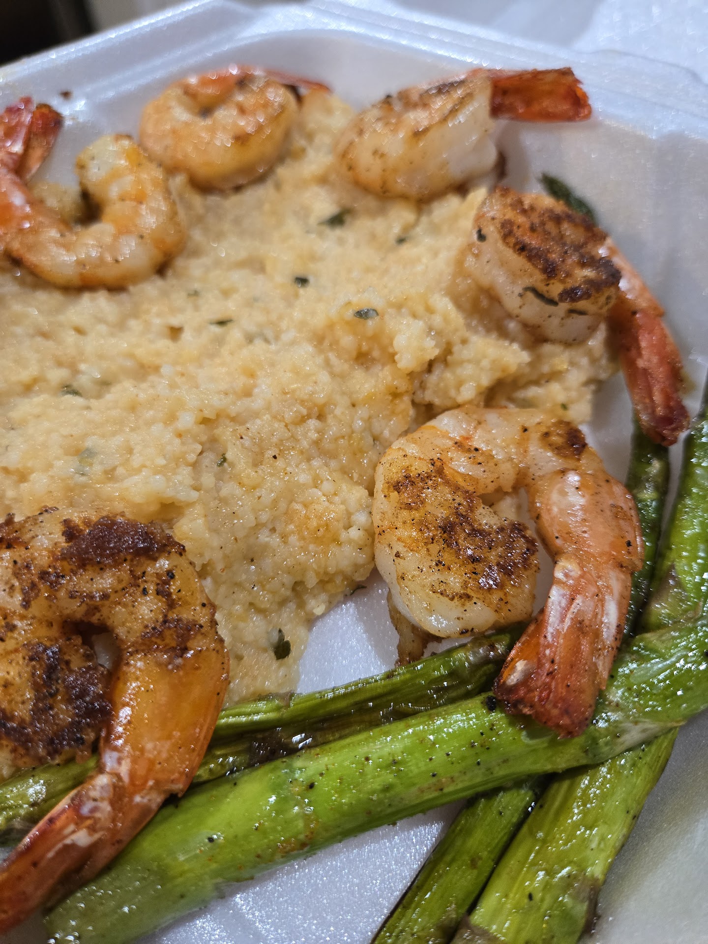 I was wary of what I saw on other plates seafood-wise, so I ordered Ribeye and Shrimp. All I can say is Frozen and thawed. The shrimp were TINY. The steak? Don't make me laugh. Paper thin and overcooked.