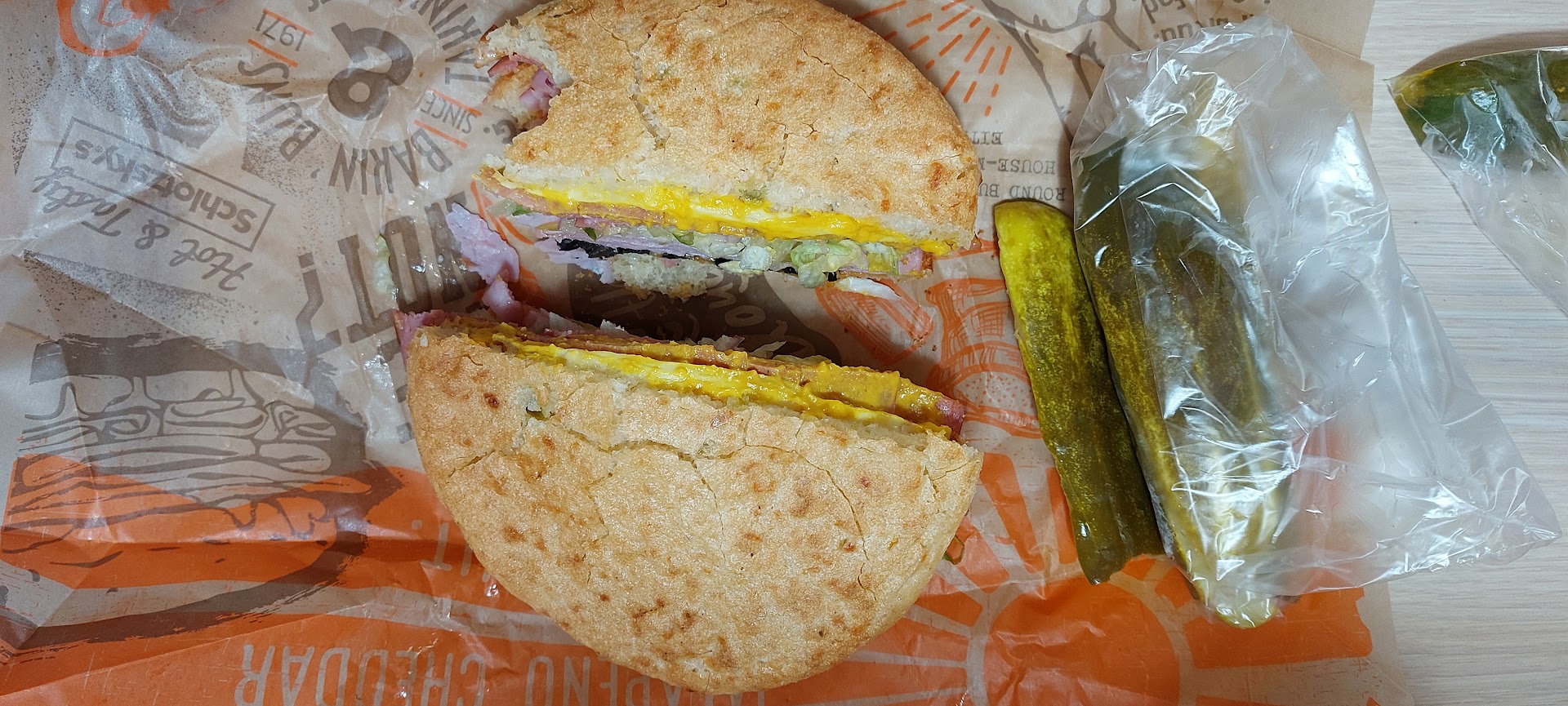 I use to love Schlotzky's for their amazing sandwiches. So I was excited to try this one out. There have been a lot of changes to my beloved place and not all for good. First the prices!! Can we say WOW!! You look and think it is the combo price and the. You find out that is just the sandwich 🥪 🙄 price. Mine was over 9 bucks. The you add on the combo for another 3 dollars. So I am thinking 🤔 this is going to be amazing right??? Well you would be wrong. The sandwich was dry and the meat tasted like it was sitting under a heat lamp too long. (Can you say 👞 shoe leather) my daughter said hers was good and so did my son-in-law so it might have been just mine. The combo comes with a bag of trips and medium soda. For three of us it cost over $60. The only extra I got was a cup of soup that was tiny for the price and one cinnamon roll (which was not bad but would have been better warm not cold). Definitely disappointed and you had to wait over 15 min in line and another 25 for the food. They give you no condiments and you have to go and wait in line to get anything they didn't give you....