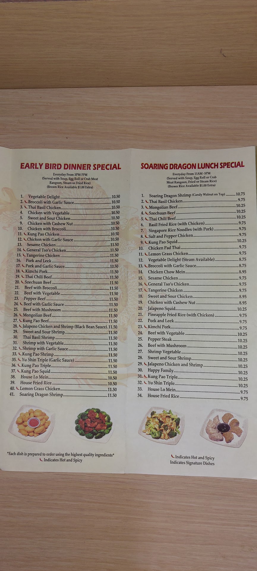 Ā Ā Ā Read moreSoaring Dragon is a refreshing take on tradition American-Chinese fair. A lot of the dishes are going to be familiar, but they are presented in new and gorgeous ways. That being said, though, the menu is absolutely gigantic. Soaring Dragon offers every thing from Chinese food, to Japanese, to even Vietnamese. I look forward to going back soon and trying the Vietnamese pho-type soup I noticed one of the waitstaff eating on her break. It looked amazing! I loved what I ordered, and even though it was on the "early bird dinner menu special", there was so much food I ended up having to take most of it home with me. My friend and I also tried the crab rangoons, which were so super great. The edamame we shared was also delicious. All in all, food wise, I was not only impressed, but super pleased with both the taste and lovely presentation of everything!. And while I know this is something of a minor detail, I think it's pretty neat that you can order brown rice instead of the traditional white rice.