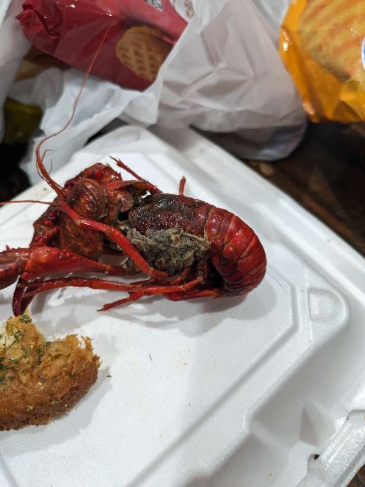 Soon my mom found three crawfish that when she opened them to eat they were black and smelled awful. Three. The waitress took them back and nothing.