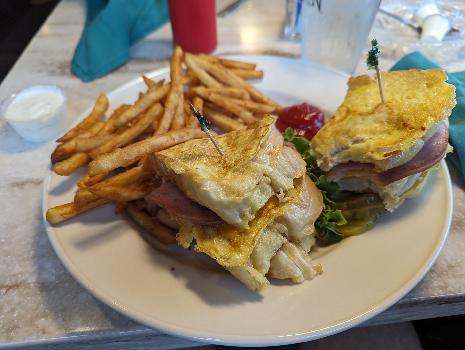 I ordered the Monte Cristo with a cup of salmon chowder- the chowder came first, before the calamari, and it was decent. That would probably be the only thing I would be order, but I do not plan on returning. The sandwich was awful. I couldn’t even eat it. The bread was soggy because they didn’t cook the egg all the way through. And why are you using that nasty plastic American cheese? I had one bite and lost my appetite.