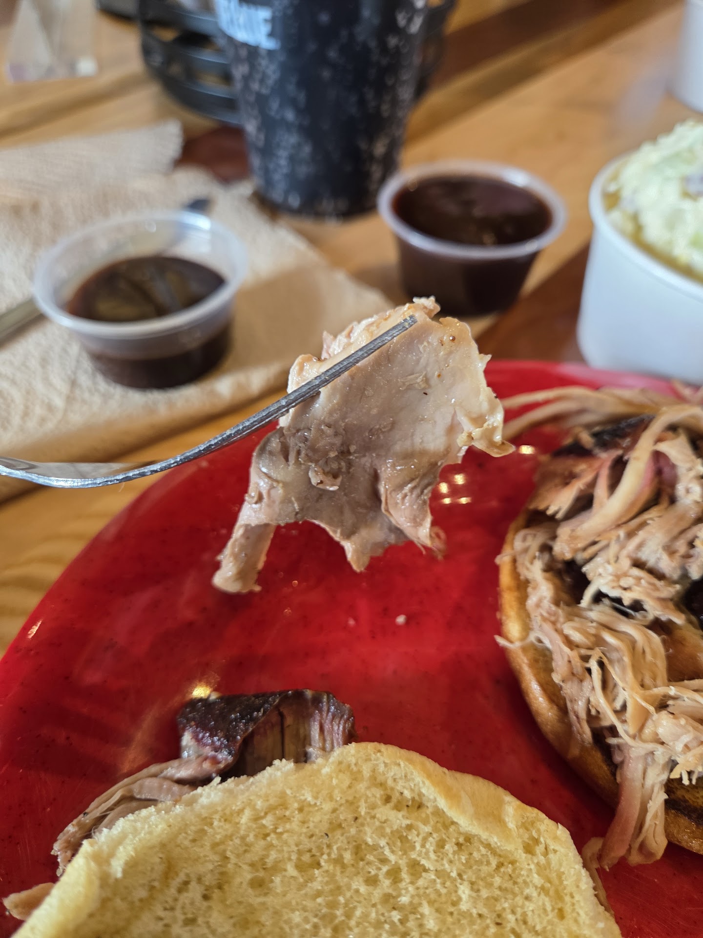 I had never been to this restaurant before, and after my many questions, a manager named Nathan took notice and offered samples to help me make my decision, which I thought was impressive. I sat down at a high-topped table, very clean, and was able to observe the drink station and barbecue sauce station to set me up before my food came. I opted for the sweet tea and lemonade mixed, which was absolutely delicious, and some extra original sauce. By the time I returned with my drink, my food was meeting me there as well, with the manager Nathan dropping off the food and making sure I was all set before carrying on to help behind the counter—once again, impressive and attentive.