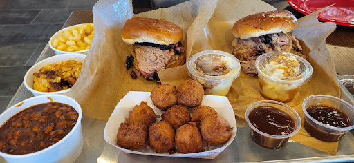 We chose brisket and pork sandwiches with Mac and cheese, corn pudding, baked beans and hush puppies as sides. Also soft drinks. They treated us with banana cream pudding as a dessert. Everything was absolutely delicious.